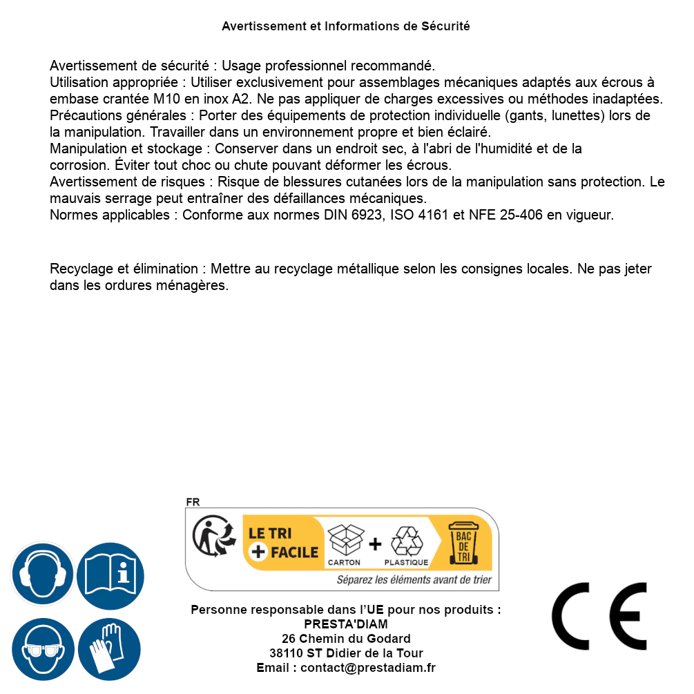 | AVERTISSEMENT et SECURITE | Identification de la personne responsable dans l’UE : Nom : PRESTA'DIAM. Adresse : 26 Chemin du Godard, 38110 ST Didier de la Tour (France). Email : contact@prestadiam.fr. |