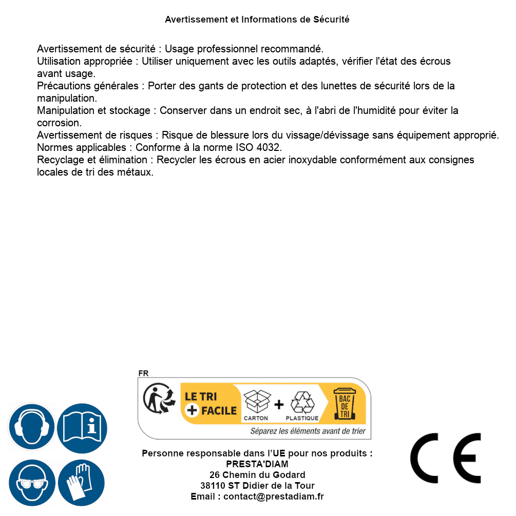 | AVERTISSEMENT et SECURITE | Identification de la personne responsable dans l’UE : Nom : PRESTA'DIAM. Adresse : 26 Chemin du Godard, 38110 ST Didier de la Tour (France). Email : contact@prestadiam.fr. |