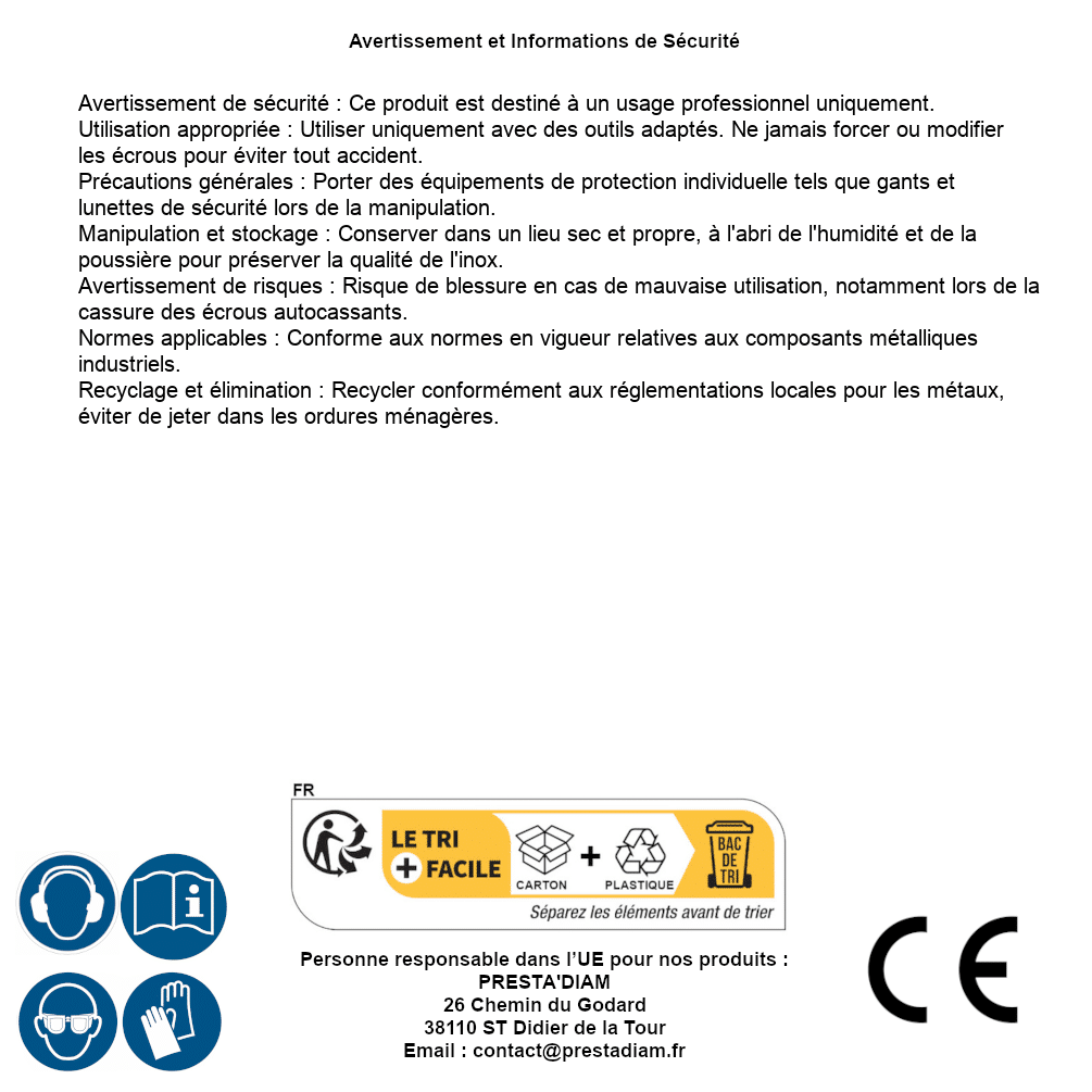 | AVERTISSEMENT et SECURITE | Identification de la personne responsable dans l’UE : Nom : PRESTA'DIAM. Adresse : 26 Chemin du Godard, 38110 ST Didier de la Tour (France). Email : contact@prestadiam.fr. |