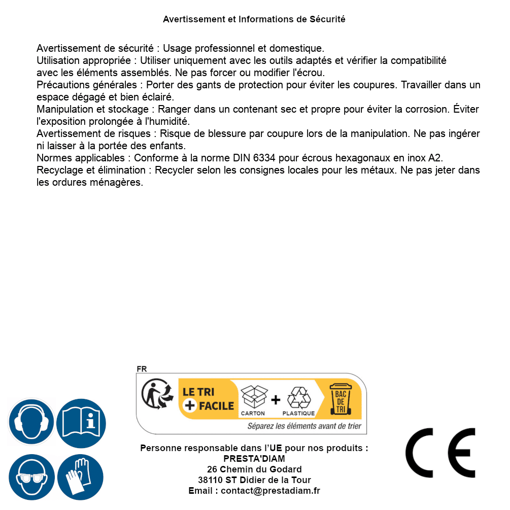 | AVERTISSEMENT et SECURITE | Identification de la personne responsable dans l’UE : Nom : PRESTA'DIAM. Adresse : 26 Chemin du Godard, 38110 ST Didier de la Tour (France). Email : contact@prestadiam.fr. |