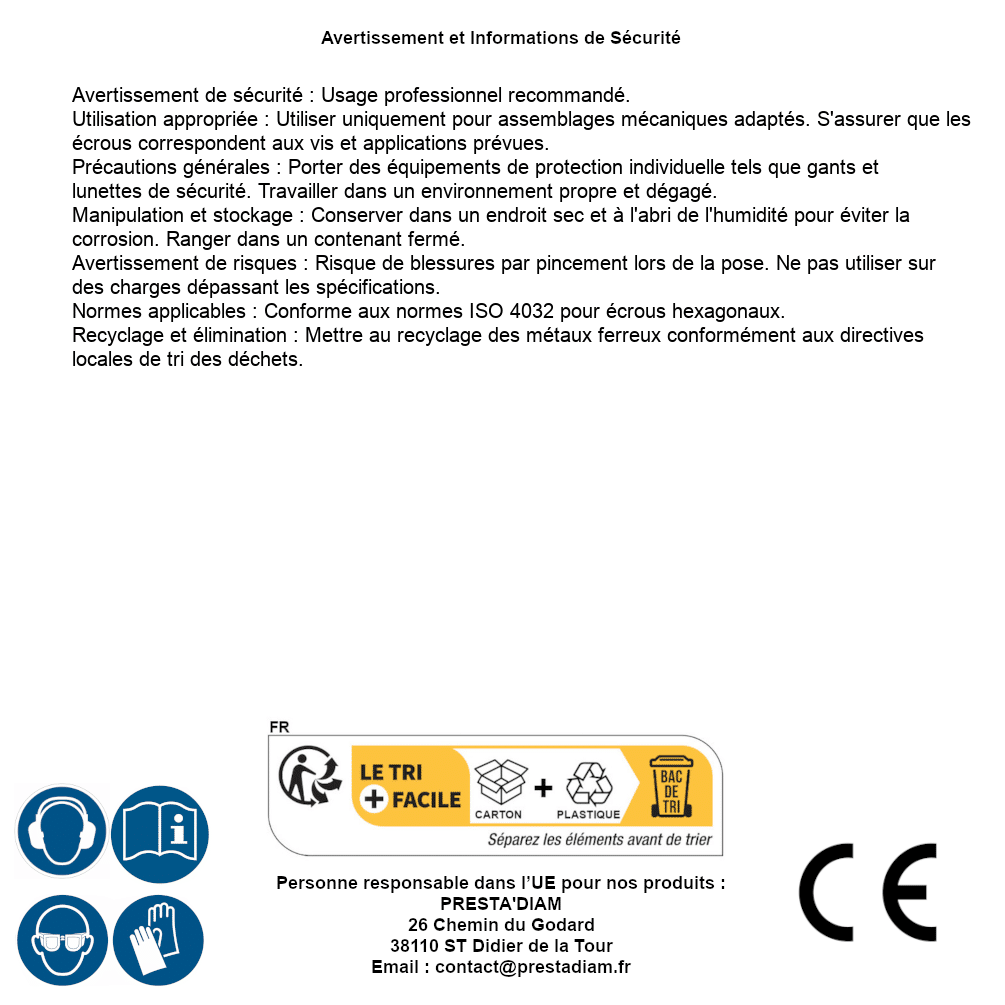 | AVERTISSEMENT et SECURITE | Identification de la personne responsable dans l’UE : Nom : PRESTA'DIAM. Adresse : 26 Chemin du Godard, 38110 ST Didier de la Tour (France). Email : contact@prestadiam.fr. |
