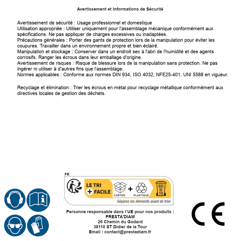 | AVERTISSEMENT et SECURITE | Identification de la personne responsable dans l’UE : Nom : PRESTA'DIAM. Adresse : 26 Chemin du Godard, 38110 ST Didier de la Tour (France). Email : contact@prestadiam.fr. |