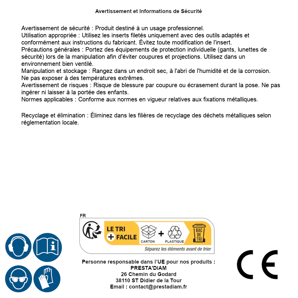 | AVERTISSEMENT et SECURITE | Identification de la personne responsable dans l’UE : Nom : PRESTA'DIAM. Adresse : 26 Chemin du Godard, 38110 ST Didier de la Tour (France). Email : contact@prestadiam.fr. |