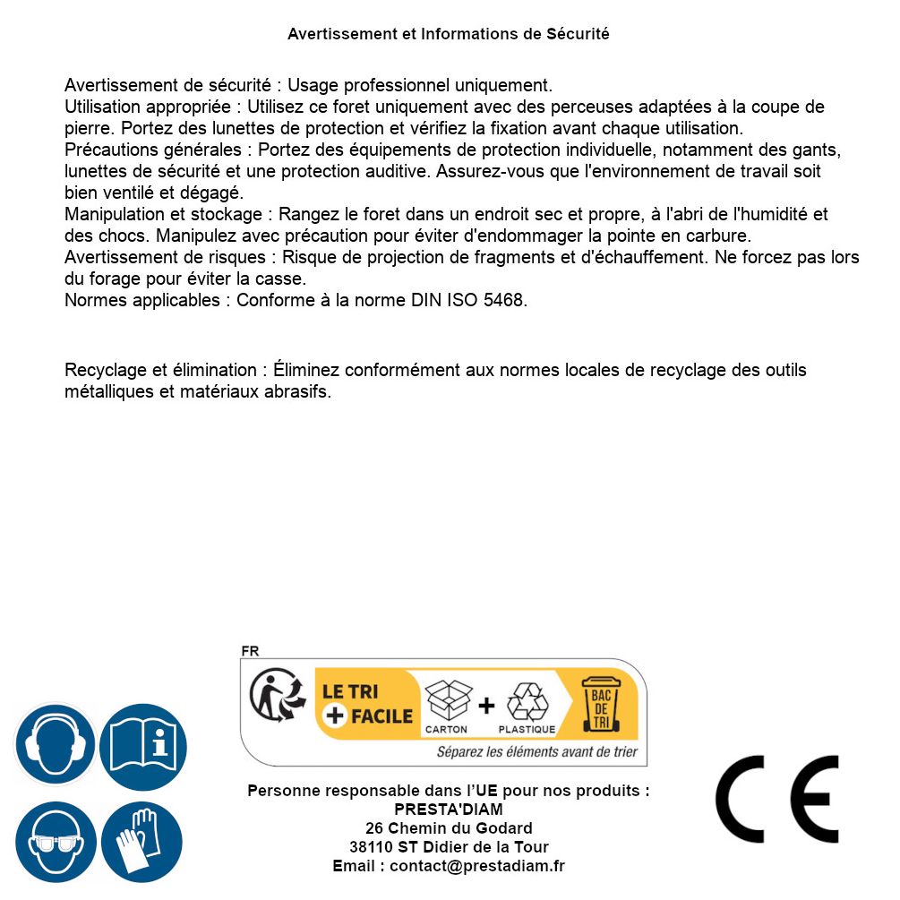 | AVERTISSEMENT et SECURITE | Identification de la personne responsable dans l’UE : Nom : PRESTA'DIAM. Adresse : 26 Chemin du Godard, 38110 ST Didier de la Tour (France). Email : contact@prestadiam.fr. |