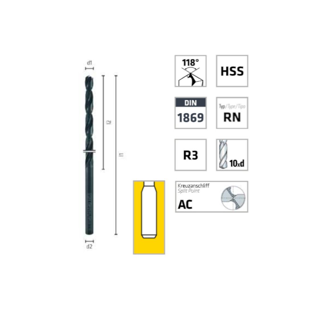 Foret Hélicoïdal HSS Extra Long DIN 1869 R3 118° D. 4.5 x Lt. 295 x Lu. 200 x Q. 4.5 mm x Z2 - Diamwood