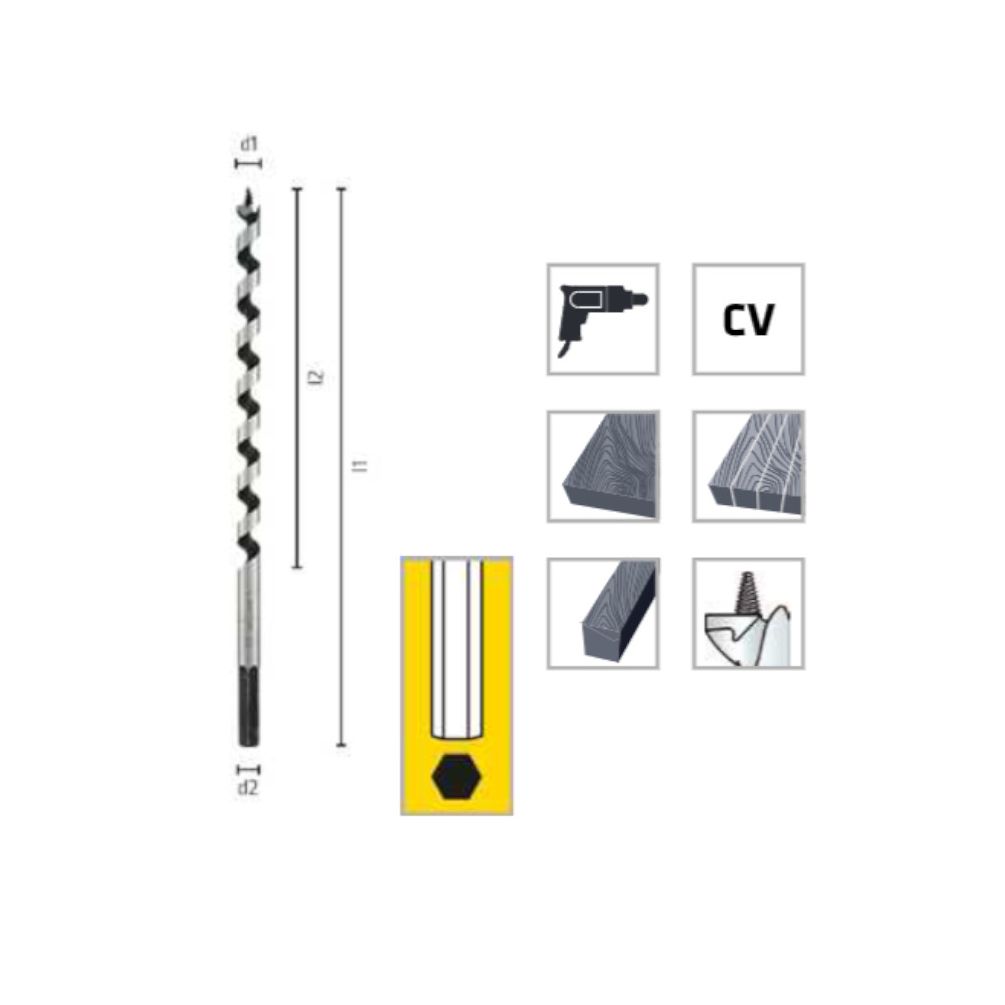 Mèche à Bois CV Forme Lewis 6 pans - Spécial Charpente Poutres D. 6 x Lt. 235 x Lu. 160 x Q. 6 mm - Diamwood