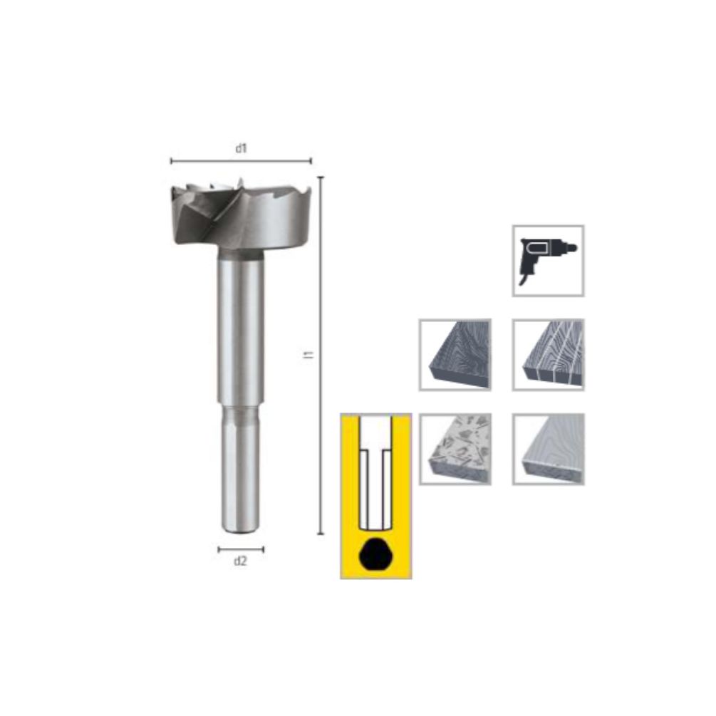 Ref. ALP-0023902600100En savoir + sur Mèche à Façonner Forstner SHARP SHARK - Queue 3 Méplats - Perçage Bois D. 26 x Lt. 90 x Lu. x Q. 8 mm x Z2 - Diamwood
