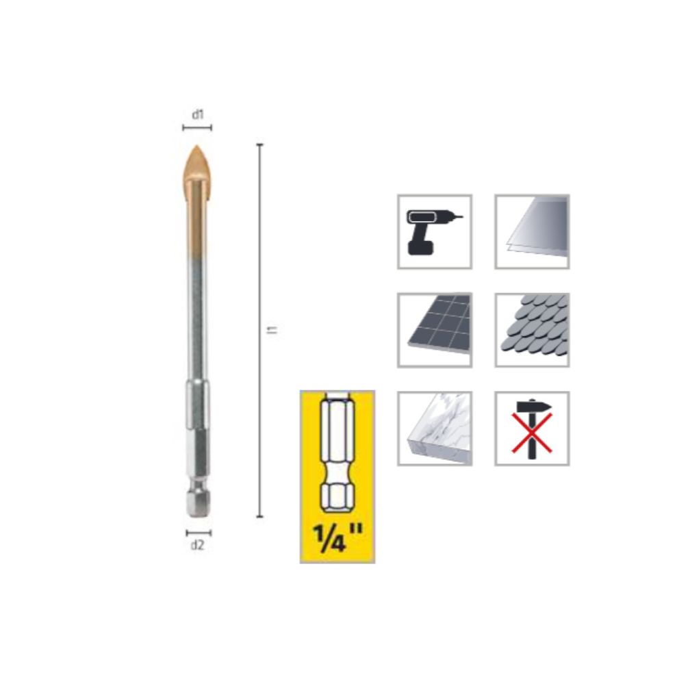 Foret Verre Carbure Tungstène - Perçage Rotatif - Verre, Porcelaine et Céramique° D. 12 x Lt. 113 x Lu. x Q. 10 mm - Diamwood