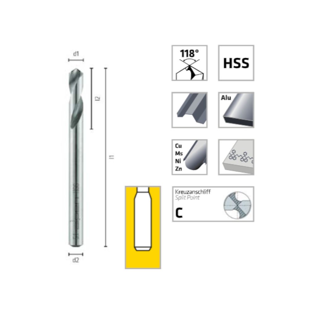 10 Forets HSS Court Pointe Fendue pour Rivets - Carrosserie, Tôlerie 118° D. 3.25 x Lt. 49 x Lu. 14 x Q. 3.25 mm x Z2 - Diamwood