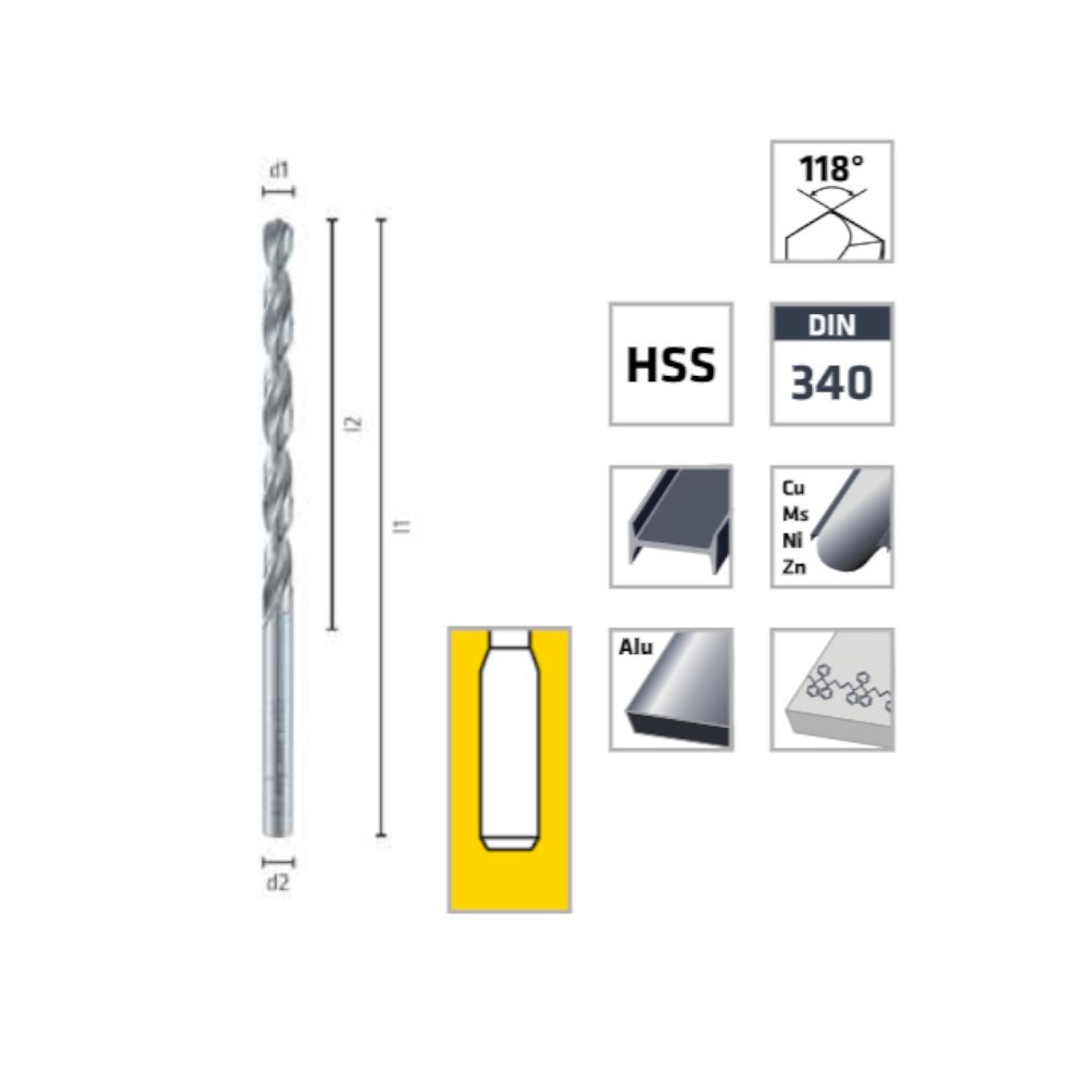 Foret Hélicoïdal HSS Extra Long DIN 1869 R1 118° D. 11.5 x Lt. 280 x Lu. 195 x Q. 11.5 mm x Z2 - Diamwood