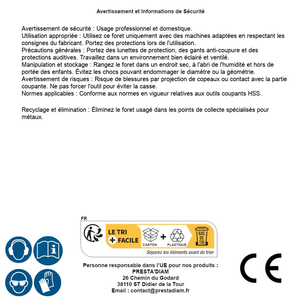 | AVERTISSEMENT et SECURITE | Identification de la personne responsable dans l’UE : Nom : PRESTA'DIAM. Adresse : 26 Chemin du Godard, 38110 ST Didier de la Tour (France). Email : contact@prestadiam.fr. |