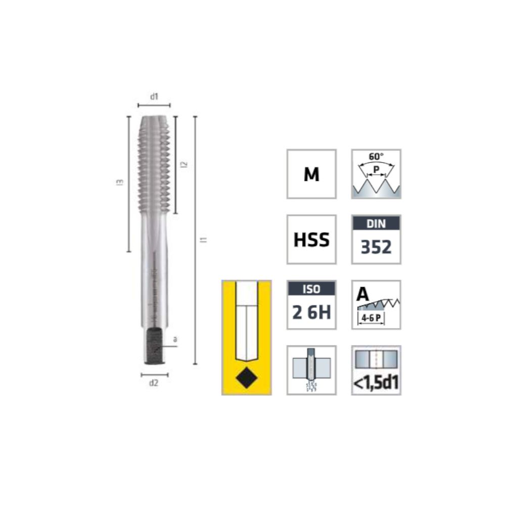 Taraud HSS Coupe Droite Métrique ISO DIN 13 - Aciers, Fontes 60° M10 x 1.5 x Lt. 41 x Lu. 21 x Q. 6.35 mm x Z4-6 P - Diamwood