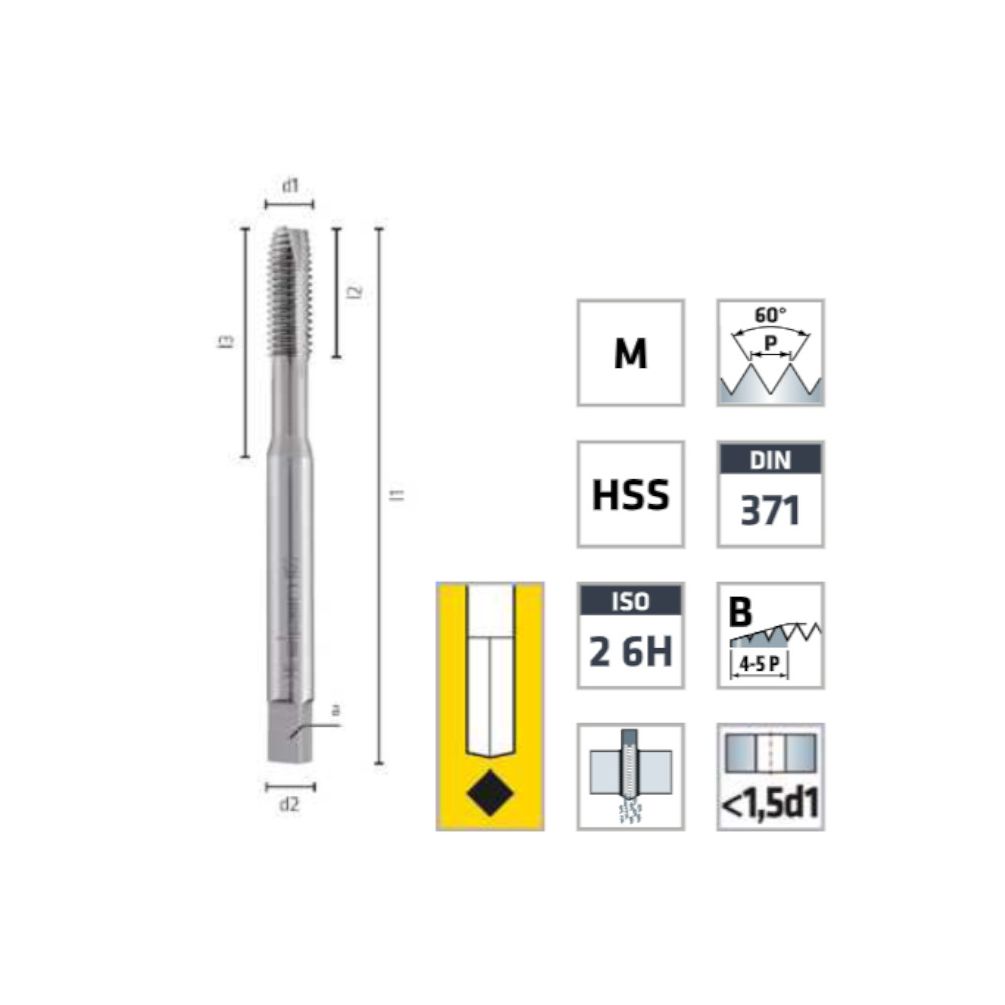 Taraud HSS Coupe Droite Métrique ISO DIN 13 - Aciers, Fontes 60° M10 x 1.5 x Lt. 41 x Lu. 21 x Q. 6.35 mm x Z4-6 P - Diamwood