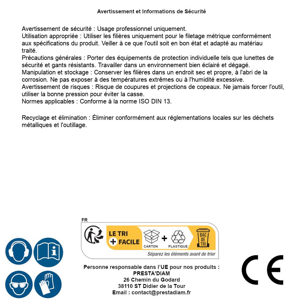 | AVERTISSEMENT et SECURITE | Identification de la personne responsable dans l’UE : Nom : PRESTA'DIAM. Adresse : 26 Chemin du Godard, 38110 ST Didier de la Tour (France). Email : contact@prestadiam.fr. |