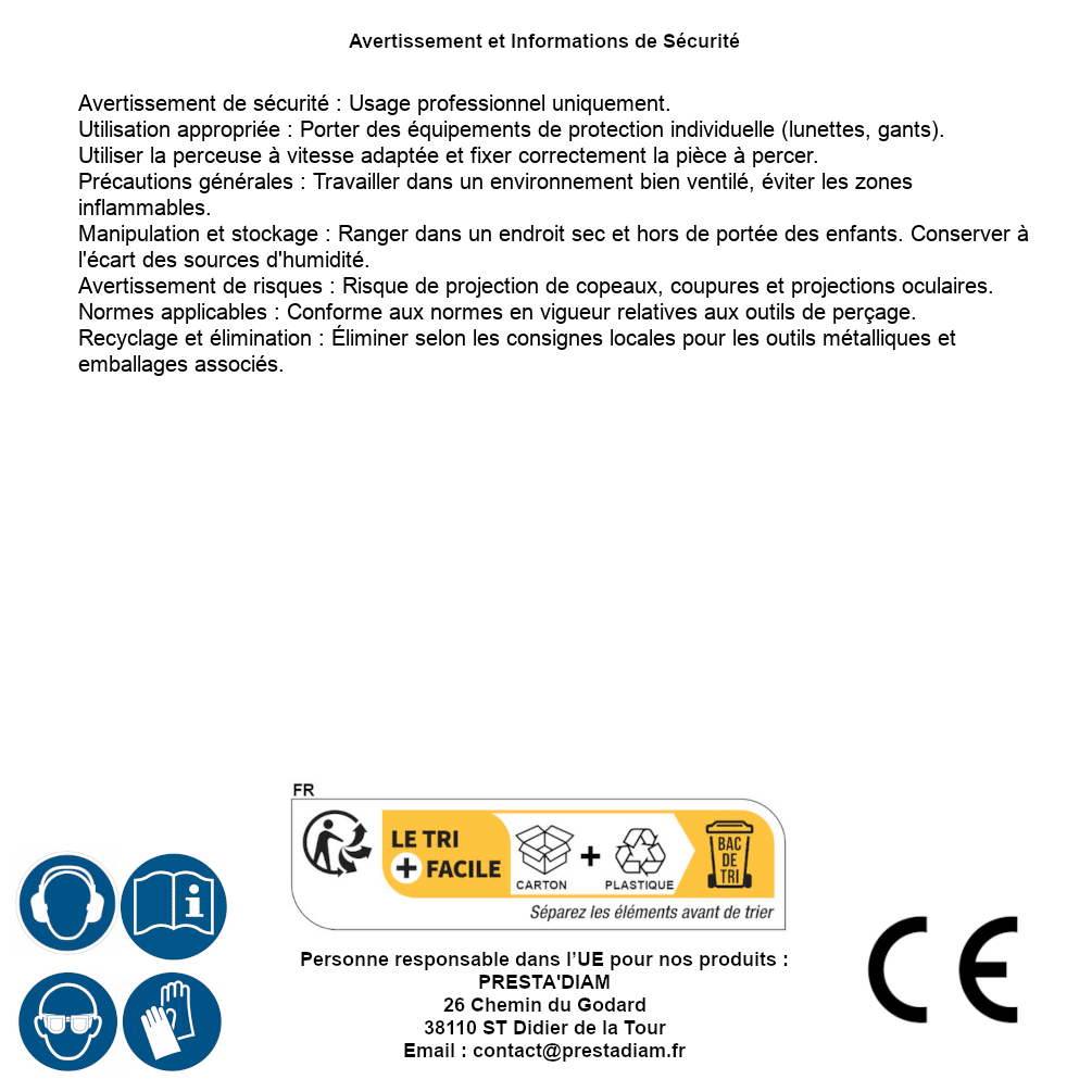 | AVERTISSEMENT et SECURITE | Identification de la personne responsable dans l’UE : Nom : PRESTA'DIAM. Adresse : 26 Chemin du Godard, 38110 ST Didier de la Tour (France). Email : contact@prestadiam.fr. |