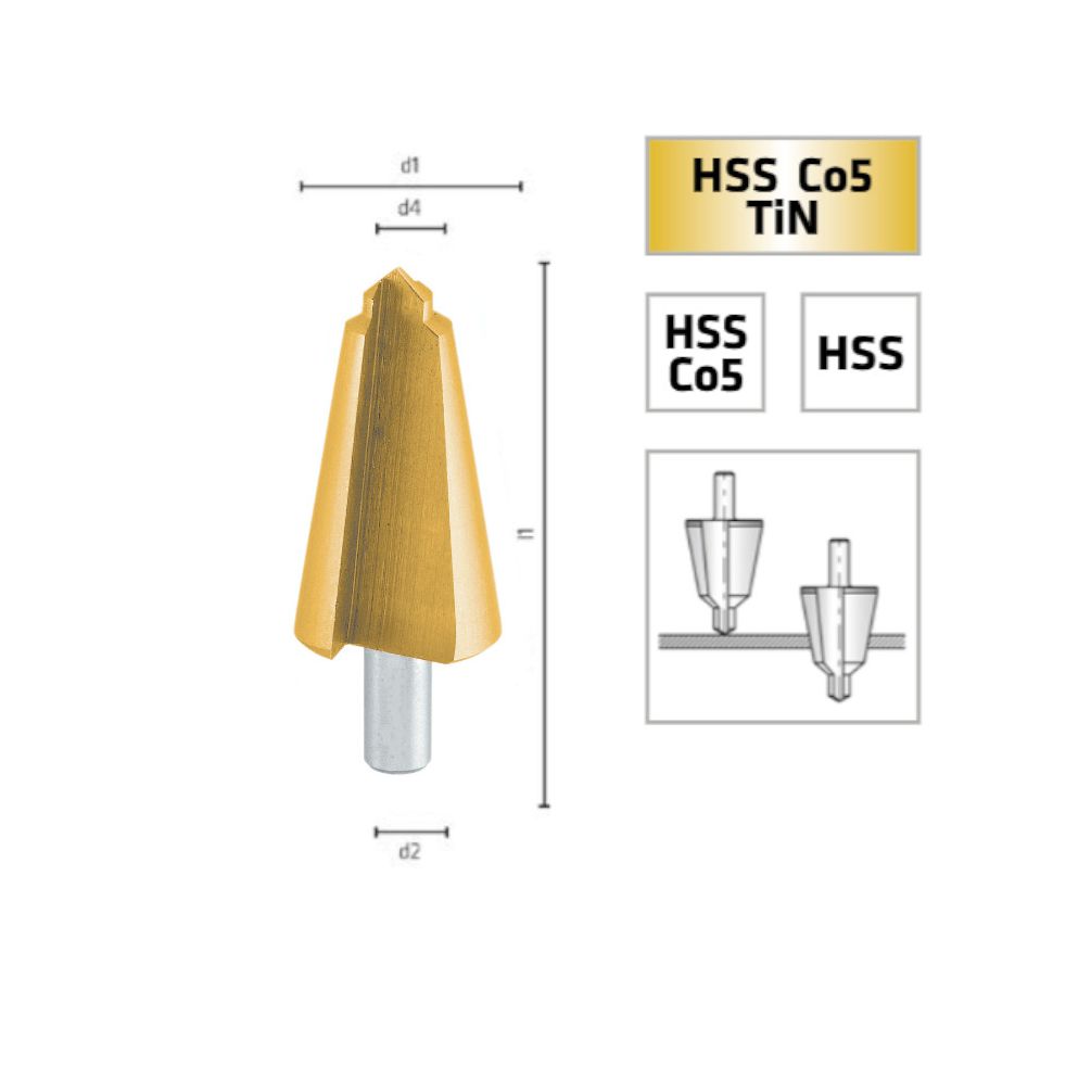 Foret Étagé Conecut HSS Cobalt TiN - Inox, Matériaux Tendres D. 16.00-30.00 x Q. 10 mm x Z2 - Diamwood
