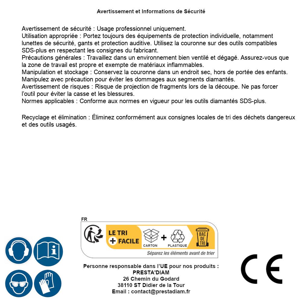 | AVERTISSEMENT et SECURITE | Identification de la personne responsable dans l’UE : Nom : PRESTA'DIAM. Adresse : 26 Chemin du Godard, 38110 ST Didier de la Tour (France). Email : contact@prestadiam.fr. |