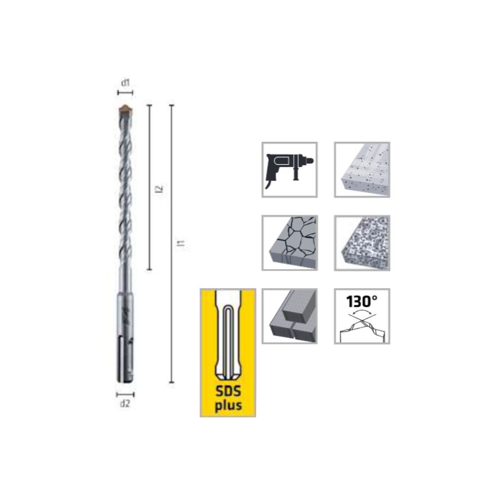 Ce foret est recommandé pour le perçage de béton, pierre et maçonnerie dans des travaux de construction, rénovation et bricolage. Il s'utilise avec un marteau perforateur SDS-Plus. Pour une efficacité optimale, utiliser avec un équipement de protection adapté et respecter les consignes de sécurité du matériel.