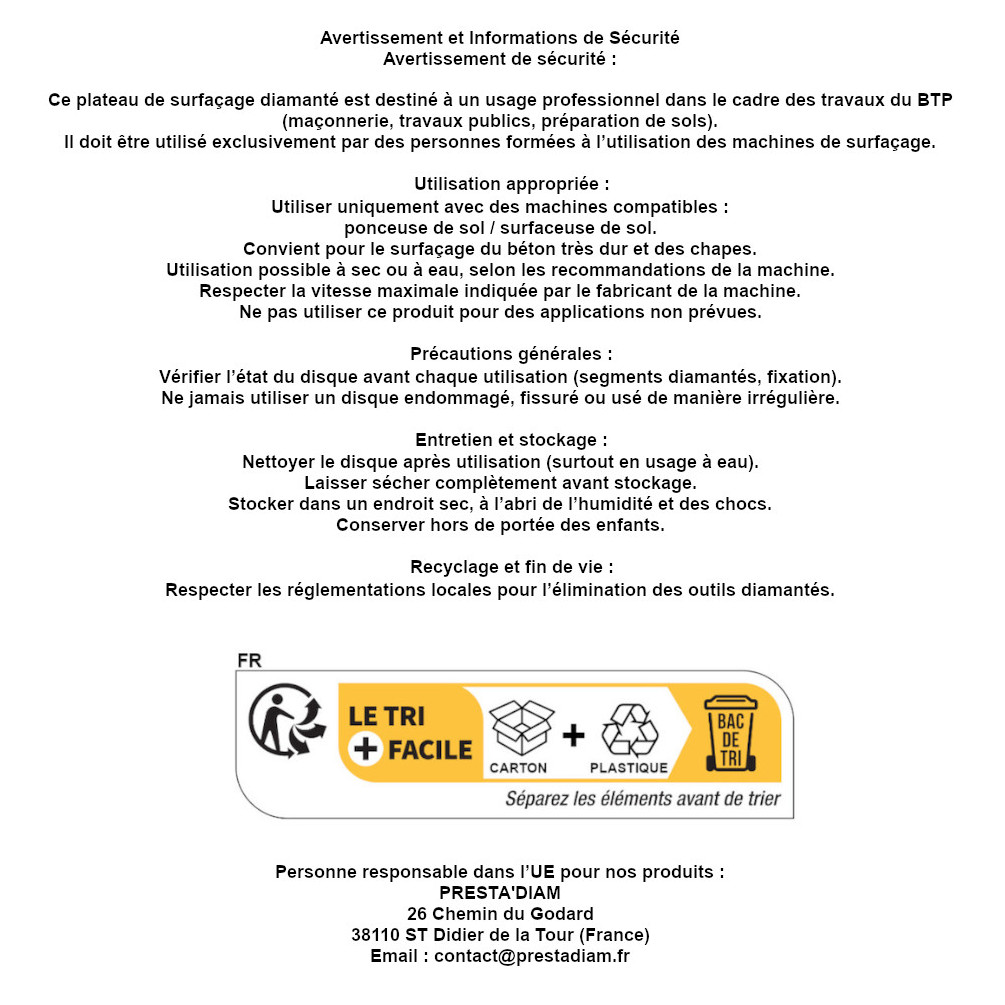 | AVERTISSEMENT et SECURITE | Avertissement et Informations de Sécurité Avertissement de sécurité : Ce produit est destiné à un usage professionnel ou domestique. Veuillez suivre les instructions ci-dessous pour garantir une utilisation sûre : Utilisation appropriée : Utilisez cet outil uniquement conformément aux instructions fournies. Ne pas utiliser cet outil pour des applications non prévues. Précautions générales : Toujours porter des équipements de protection individuelle (gants, lunettes de sécurité, protection auditive). Assurez-vous que la zone de travail est propre et dégagée. Ne pas utiliser l'outil près de l'eau ou dans des conditions humides. Manipulation et stockage : Conservez l'outil hors de portée des enfants. Rangez l'outil dans un endroit sec et sécurisé lorsque vous ne l'utilisez pas. Vérifiez régulièrement l'état de l'outil. En cas de dommages, retirez-le immédiatement de l'utilisation. Avertissement de risques : Cet outil peut présenter des risques de coupure, d'écrasement ou d'autres blessures. En cas de blessure, consultez un médecin immédiatement. Recyclage et élimination : Respectez les réglementations locales pour l'élimination de ce produit Personne responsable dans l’UE pour nos produits : PRESTA'DIAM 26 Chemin du Godard 38110 ST Didier de la Tour Email : contact@prestadiam.fr |