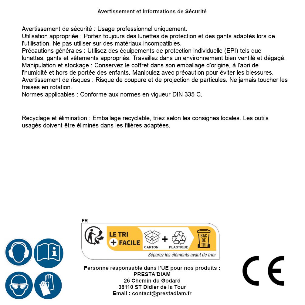 | AVERTISSEMENT et SECURITE | Identification de la personne responsable dans l’UE : Nom : PRESTA'DIAM. Adresse : 26 Chemin du Godard, 38110 ST Didier de la Tour (France). Email : contact@prestadiam.fr. |
