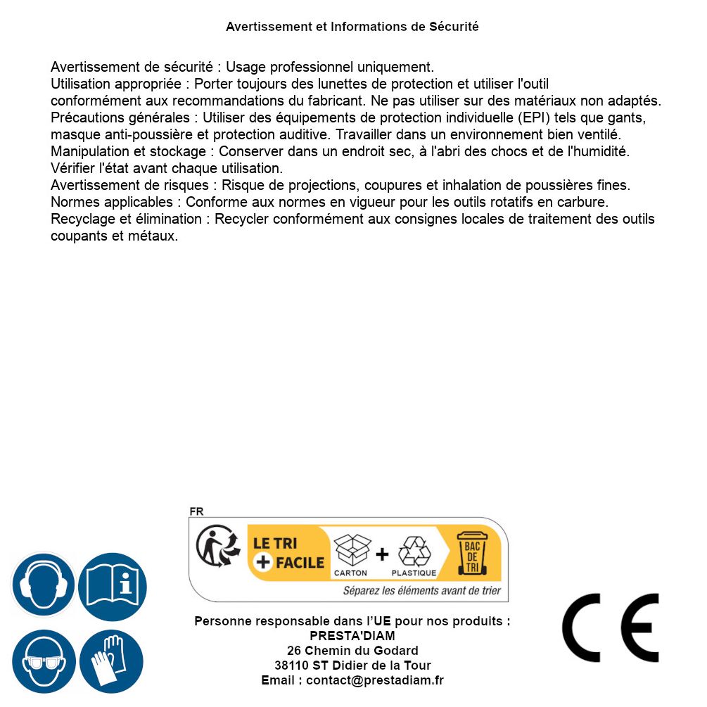 | AVERTISSEMENT et SECURITE | Identification de la personne responsable dans l’UE : Nom : PRESTA'DIAM. Adresse : 26 Chemin du Godard, 38110 ST Didier de la Tour (France). Email : contact@prestadiam.fr. |