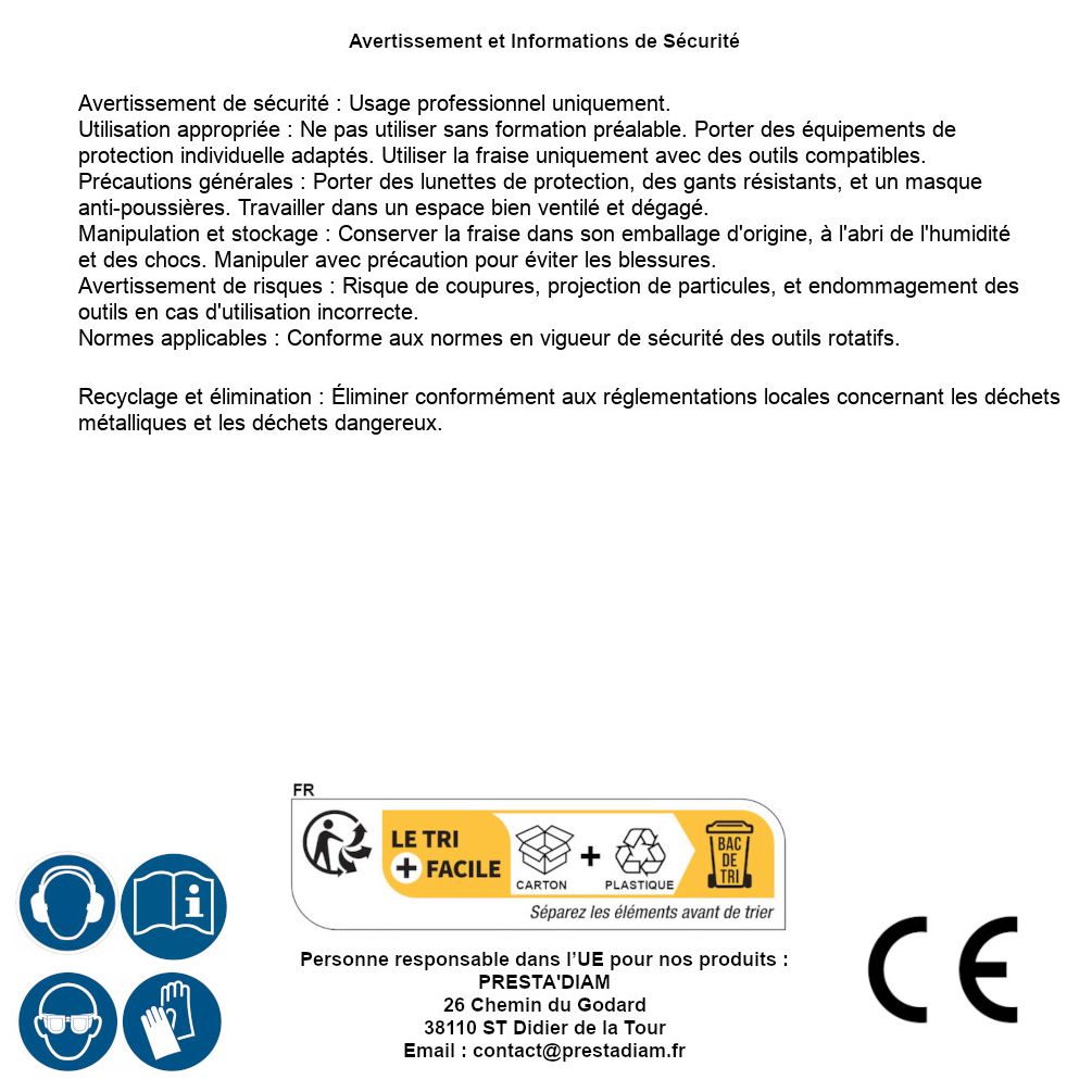 | AVERTISSEMENT et SECURITE | Identification de la personne responsable dans l’UE : Nom : PRESTA'DIAM. Adresse : 26 Chemin du Godard, 38110 ST Didier de la Tour (France). Email : contact@prestadiam.fr. |