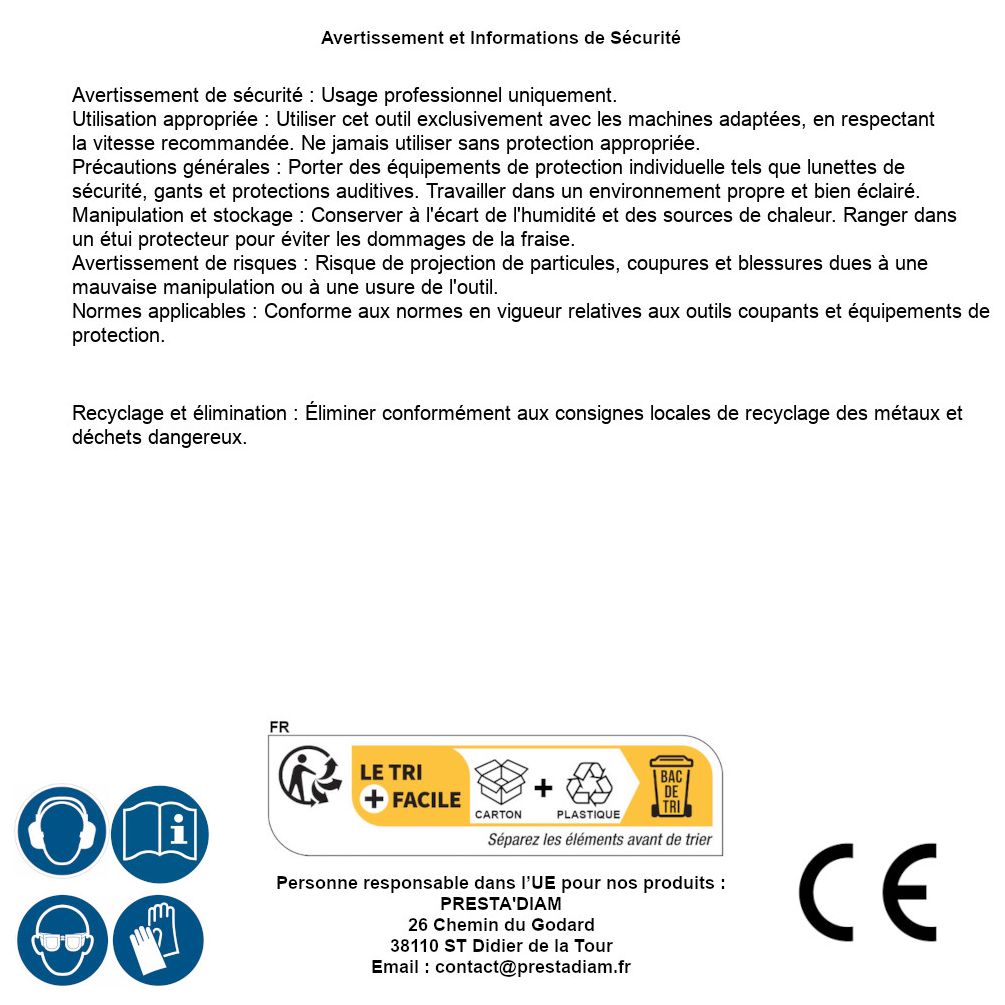 | AVERTISSEMENT et SECURITE | Identification de la personne responsable dans l’UE : Nom : PRESTA'DIAM. Adresse : 26 Chemin du Godard, 38110 ST Didier de la Tour (France). Email : contact@prestadiam.fr. |