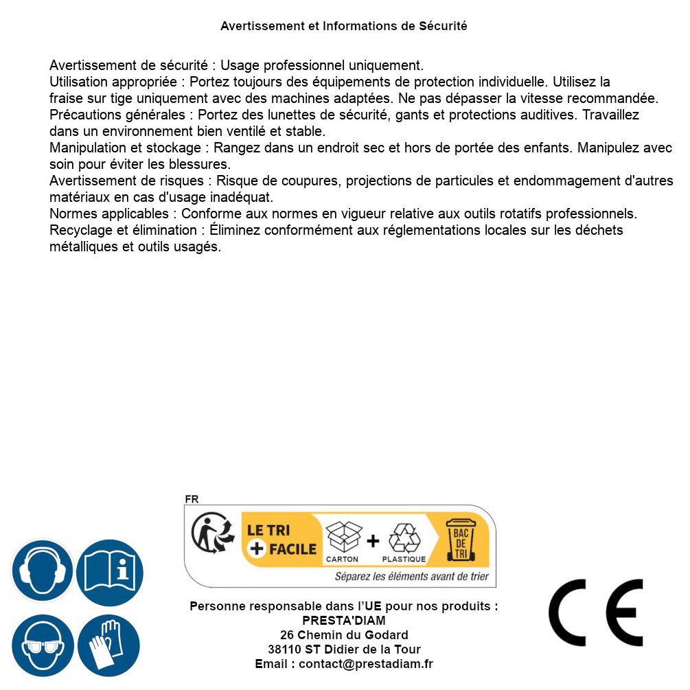 | AVERTISSEMENT et SECURITE | Identification de la personne responsable dans l’UE : Nom : PRESTA'DIAM. Adresse : 26 Chemin du Godard, 38110 ST Didier de la Tour (France). Email : contact@prestadiam.fr. |