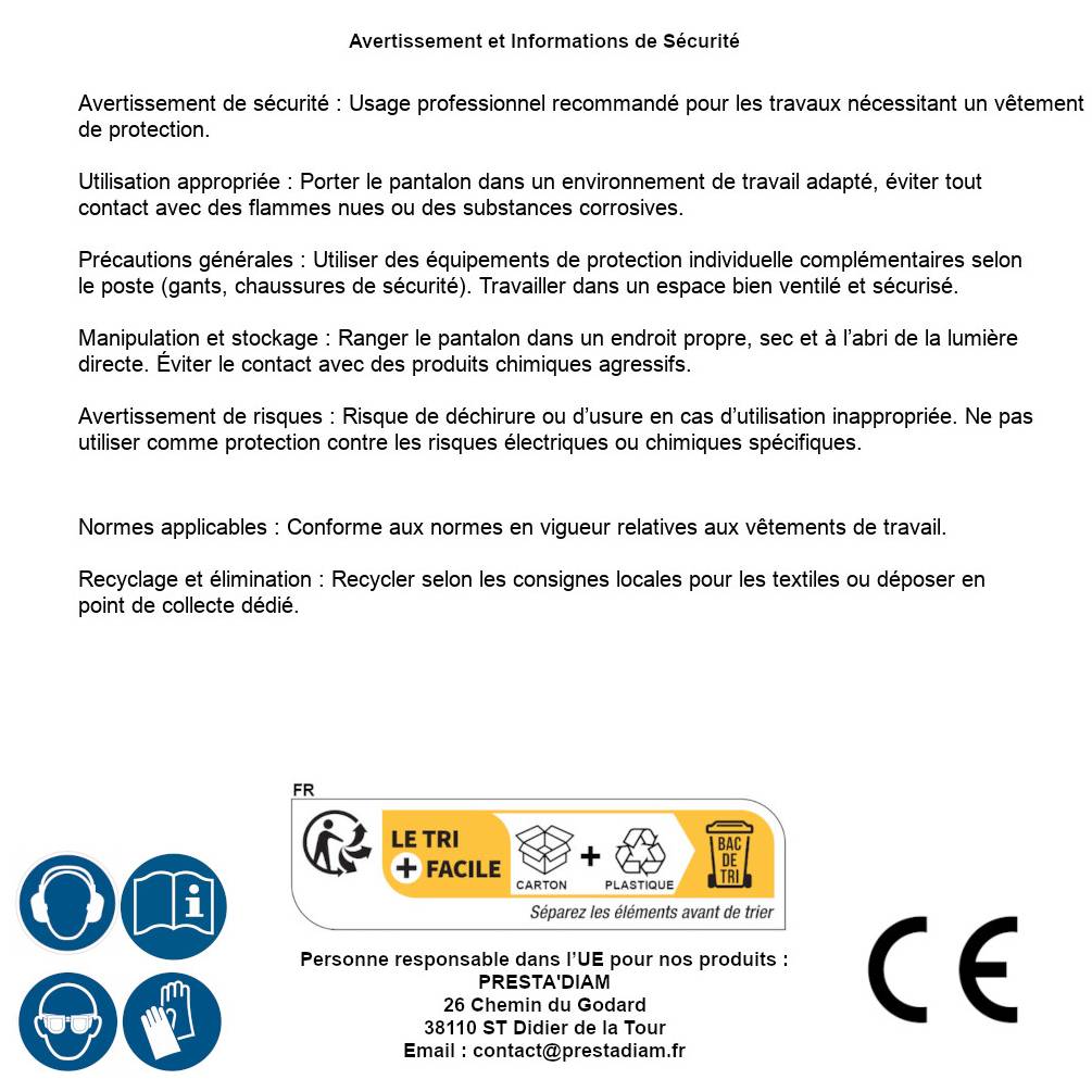 | Personne responsable UE | PRESTA'DIAM 26 Chemin du Godard 38110 ST Didier de la Tour Email : contact@prestadiam.fr |