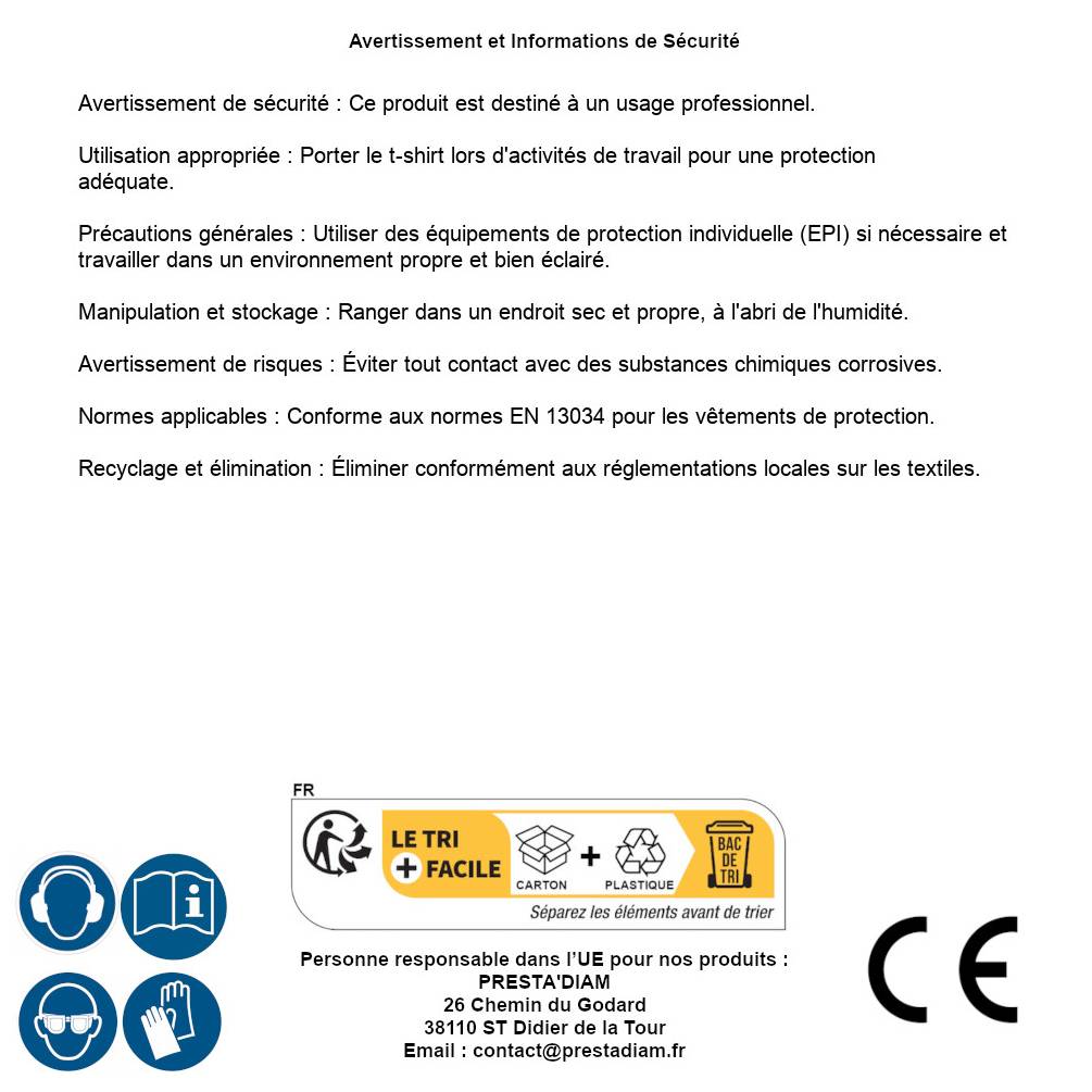 | Personne responsable UE | PRESTA'DIAM 26 Chemin du Godard 38110 ST Didier de la Tour Email : contact@prestadiam.fr |