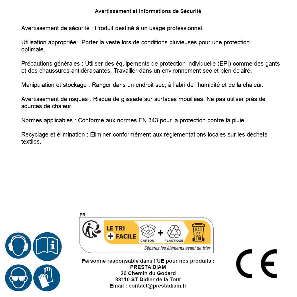 Pour un usage optimal, portez la veste par-dessus des vêtements de travail adaptés. Assurez-vous de la nettoyer régulièrement pour maintenir ses propriétés imperméables.