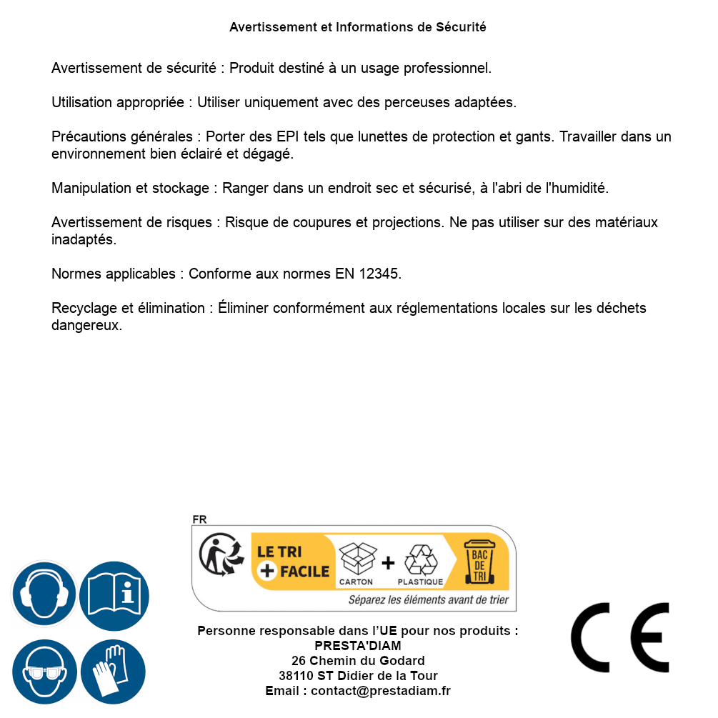 | AVERTISSEMENT et SECURITE | Avertissement de sécurité : Produit destiné à un usage professionnel. Utilisation appropriée : Utiliser uniquement avec des perceuses adaptées. Précautions générales : Porter des EPI tels que lunettes de protection et gants. Travailler dans un environnement bien éclairé et dégagé. Manipulation et stockage : Ranger dans un endroit sec et sécurisé, à l'abri de l'humidité. Avertissement de risques : Risque de coupures et projections. Ne pas utiliser sur des matériaux inadaptés. Normes applicables : Conforme aux normes EN 12345. Recyclage et élimination : Éliminer conformément aux réglementations locales sur les déchets dangereux. Identification de la personne responsable dans l’UE : Nom : PRESTA'DIAM. Adresse : 26 Chemin du Godard, 38110 ST Didier de la Tour (France). Email : contact@prestadiam.fr. |