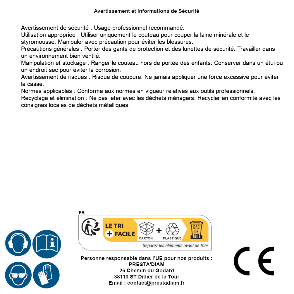 | AVERTISSEMENT et SECURITE | Identification de la personne responsable dans l’UE : Nom : PRESTA'DIAM. Adresse : 26 Chemin du Godard, 38110 ST Didier de la Tour (France). Email : contact@prestadiam.fr. |