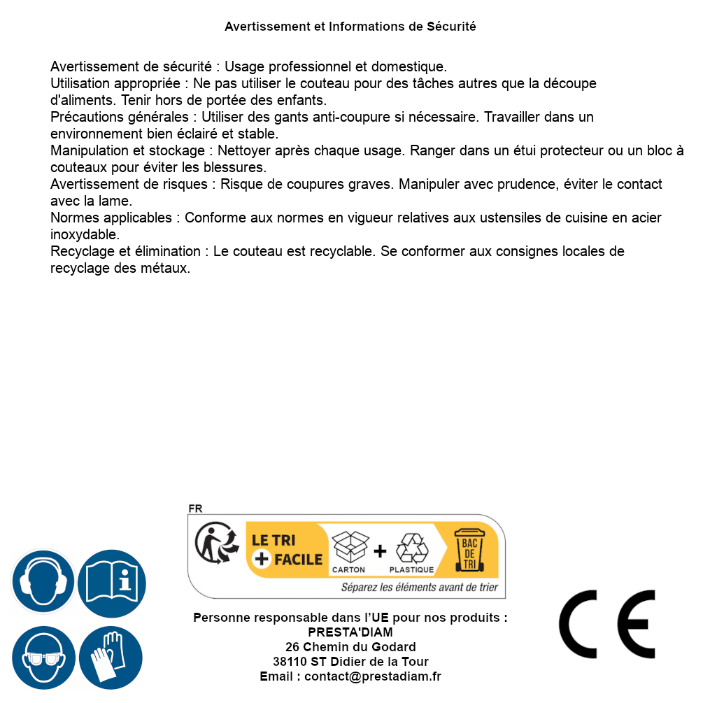 | AVERTISSEMENT et SECURITE | Identification de la personne responsable dans l’UE : Nom : PRESTA'DIAM. Adresse : 26 Chemin du Godard, 38110 ST Didier de la Tour (France). Email : contact@prestadiam.fr. |