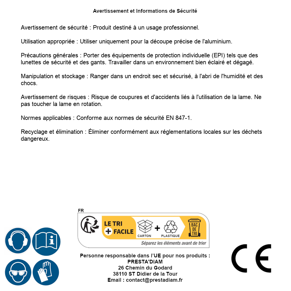 | AVERTISSEMENT et SECURITE | Avertissement de sécurité : Produit destiné à un usage professionnel.Utilisation appropriée : Utiliser uniquement pour la découpe précise de l'aluminium.Précautions générales : Porter des équipements de protection individuelle (EPI) tels que des lunettes de sécurité et des gants. Travailler dans un environnement bien éclairé et dégagé.Manipulation et stockage : Ranger dans un endroit sec et sécurisé, à l'abri de l'humidité et des chocs.Avertissement de risques : Risque de coupures et d'accidents liés à l'utilisation de la lame. Ne pas toucher la lame en rotation.Normes applicables : Conforme aux normes de sécurité EN 847-1.Recyclage et élimination : Éliminer conformément aux réglementations locales sur les déchets dangereux. Identification de la personne responsable dans l’UE : Nom : PRESTA'DIAM. Adresse : 26 Chemin du Godard, 38110 ST Didier de la Tour (France). Email : contact@prestadiam.fr. |