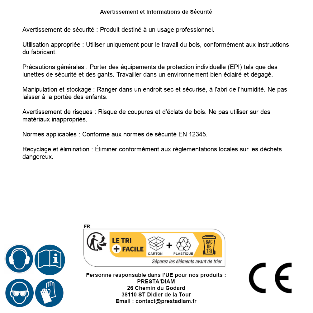 WARNING and SAFETY | Avertissement de sécurité : Produit destiné à un usage professionnel. Utilisation appropriée : Utiliser uniquement pour le travail du bois, conformément aux instructions du fabricant. Précautions générales : Porter des équipements de protection individuelle (EPI) tels que des lunettes de sécurité et des gants. Travailler dans un environnement bien éclairé et dégagé. Manipulation et stockage : Ranger dans un endroit sec et sécurisé, à l'abri de l'humidité. Ne pas laisser à la portée des enfants. Avertissement de risques : Risque de coupures et d'éclats de bois. Ne pas utiliser sur des matériaux inappropriés. Normes applicables : Conforme aux normes de sécurité EN 12345. Recyclage et élimination : Éliminer conformément aux réglementations locales sur les déchets dangereux. Identification de la personne responsable dans l’UE : Nom : PRESTA'DIAM. Adresse : 26 Chemin du Godard, 38110 ST Didier de la Tour (France). Email : contact@prestadiam.fr. |