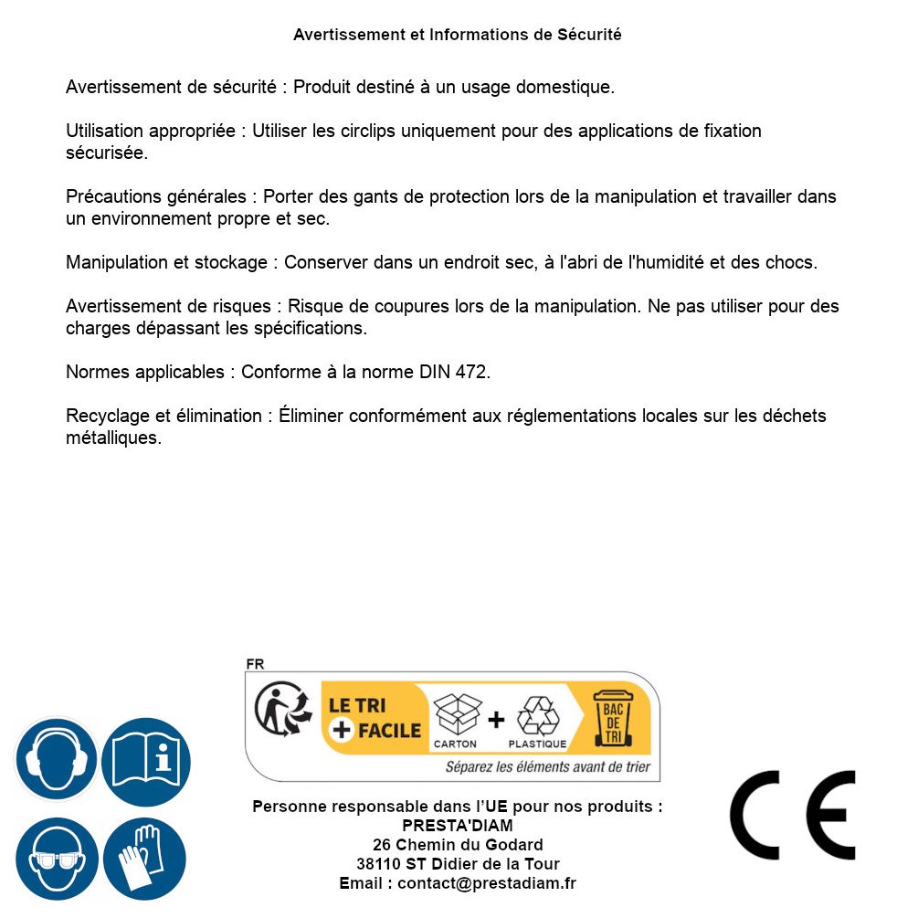 | WARNING and SAFETY | Avertissement de sécurité : Produit destiné à un usage domestique. Utilisation appropriée : Utiliser les circlips uniquement pour des applications de fixation sécurisée. Précautions générales : Porter des gants de protection lors de la manipulation et travailler dans un environnement propre et sec. Manipulation et stockage : Conserver dans un endroit sec, à l'abri de l'humidité et des chocs. Avertissement de risques : Risque de coupures lors de la manipulation. Ne pas utiliser pour des charges dépassant les spécifications. Normes applicables : Conforme à la norme DIN 472. Recyclage et élimination : Éliminer conformément aux réglementations locales sur les métaux. Identification de la personne responsable dans l’UE : Nom : PRESTA'DIAM. Adresse : 26 Chemin du Godard, 38110 ST Didier de la Tour (France). Email : contact@prestadiam.fr. |