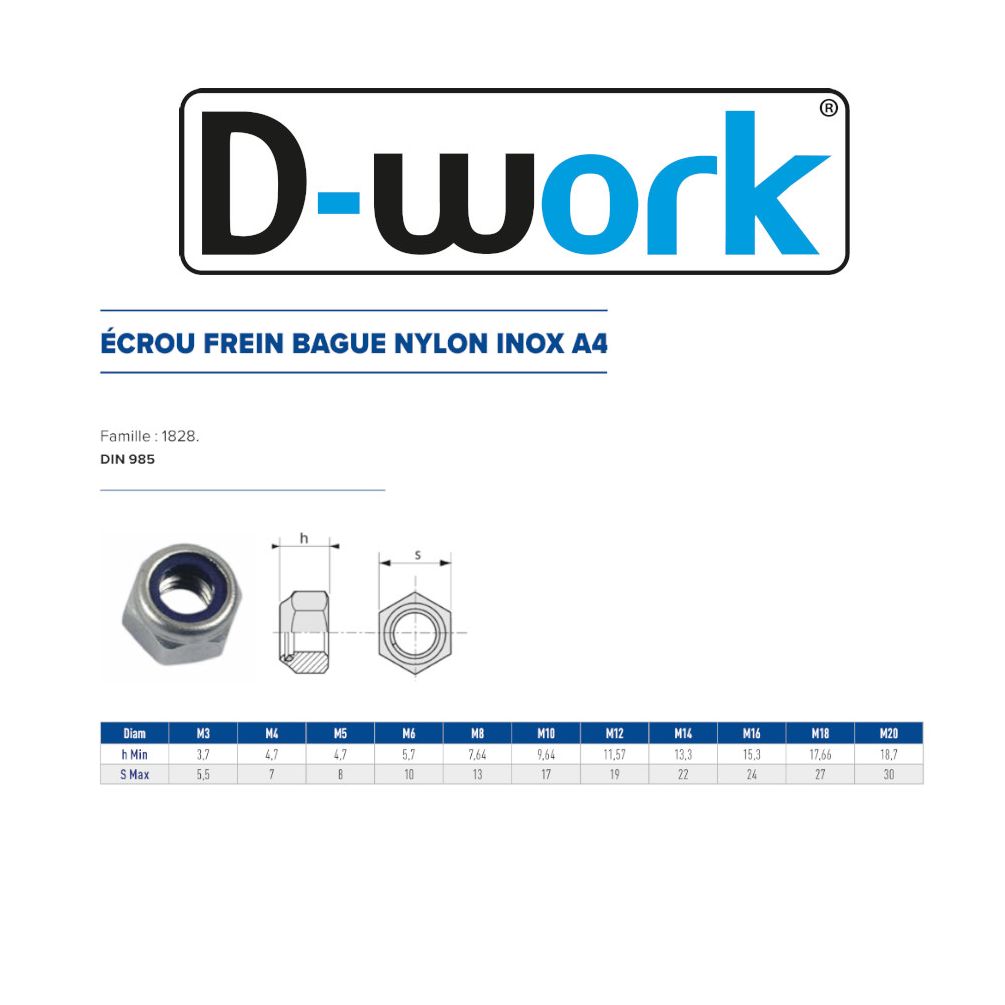 | WARNING and SAFETY | Avertissement de sécurité : Produit destiné à un usage domestique. Utilisation appropriée : Utiliser les écrous uniquement pour des applications de fixation compatibles. Précautions générales : Porter des gants de protection lors de la manipulation et travailler dans un environnement propre et sec. Manipulation et stockage : Conserver dans un endroit sec, à l'abri de l'humidité et des chocs. Avertissement de risques : Risque de coupures lors de la manipulation. Ne pas ingérer. Normes applicables : Conforme à la norme DIN 985. Recyclage et élimination : Éliminer conformément aux réglementations locales sur les métaux. Identification de la personne responsable dans l’UE : Nom : PRESTA'DIAM. Adresse : 26 Chemin du Godard, 38110 ST Didier de la Tour (France). Email : contact@prestadiam.fr. |