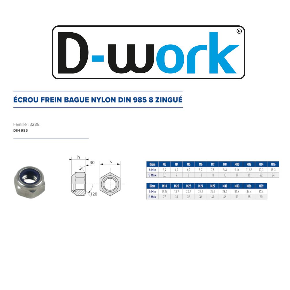 | WARNING and SAFETY | Avertissement de sécurité : Produit destiné à un usage domestique. Utilisation appropriée : Utiliser uniquement pour des applications de fixation sécurisée. Précautions générales : Porter des gants de protection lors de la manipulation et travailler dans un environnement propre et sec. Manipulation et stockage : Conserver dans un endroit sec, à l'abri de l'humidité et des chocs. Avertissement de risques : Risque de blessure par coupure ou écrasement lors de la manipulation. Normes applicables : Conforme à la norme DIN 985. Recyclage et élimination : Éliminer conformément aux réglementations locales sur les déchets métalliques. Identification de la personne responsable dans l’UE : Nom : PRESTA'DIAM. Adresse : 26 Chemin du Godard, 38110 ST Didier de la Tour (France). Email : contact@prestadiam.fr. |