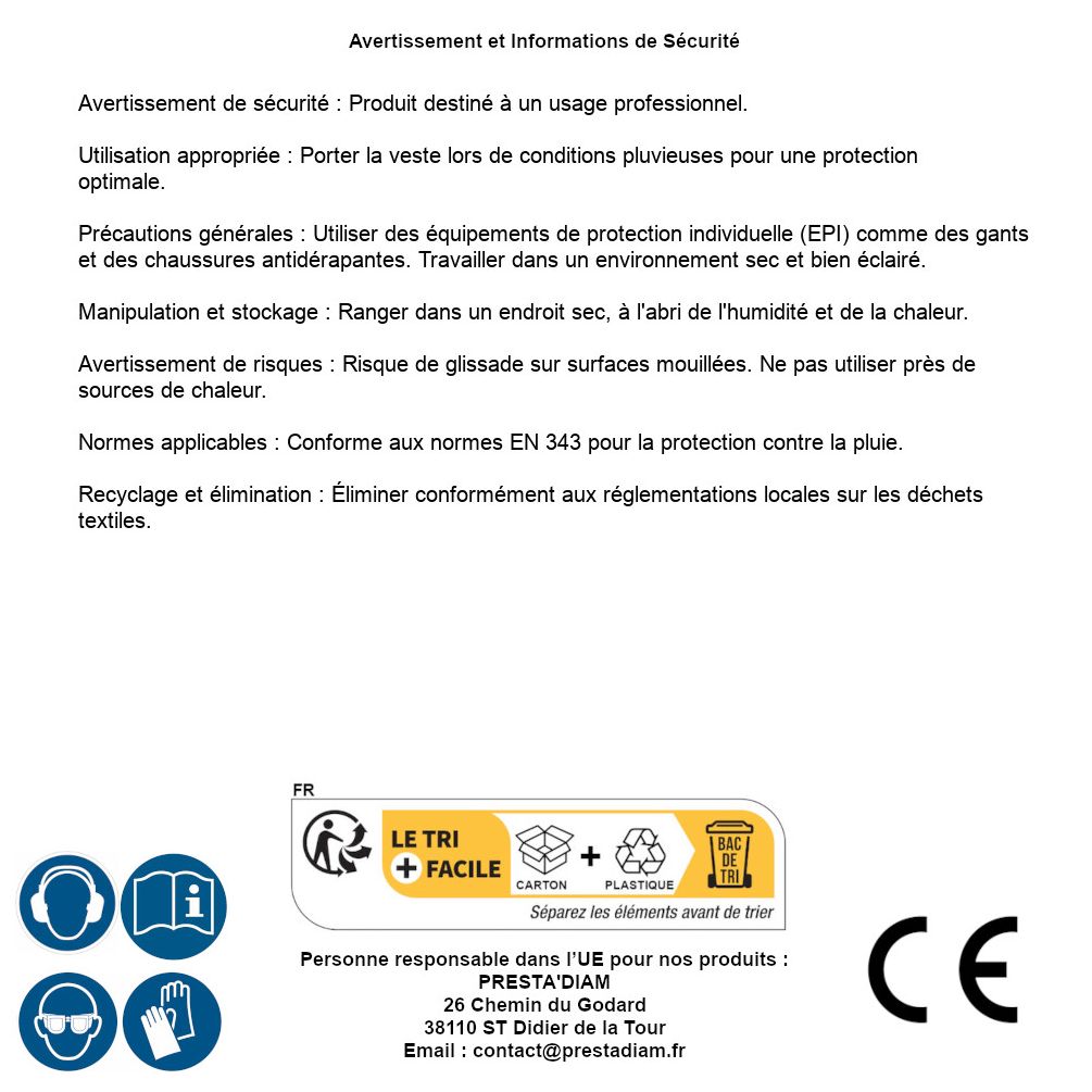 | WARNING and SAFETY | Avertissement de sécurité : Produit destiné à un usage professionnel.Utilisation appropriée : Porter la veste lors de conditions pluvieuses pour une protection optimale.Précautions générales : Utiliser des équipements de protection individuelle (EPI) comme des gants et des chaussures antidérapantes. Travailler dans un environnement sec et bien éclairé.Manipulation et stockage : Ranger dans un endroit sec, à l'abri de l'humidité et de la chaleur.Avertissement de risques : Risque de glissade sur surfaces mouillées. Ne pas utiliser près de sources de chaleur.Normes applicables : Conforme aux normes EN 343 pour la protection contre la pluie.Recyclage et élimination : Éliminer conformément aux réglementations locales sur les déchets textiles. Identification de la personne responsable dans l’UE : Nom : PRESTA'DIAM. Adresse : 26 Chemin du Godard, 38110 ST Didier de la Tour (France). Email : contact@prestadiam.fr. |