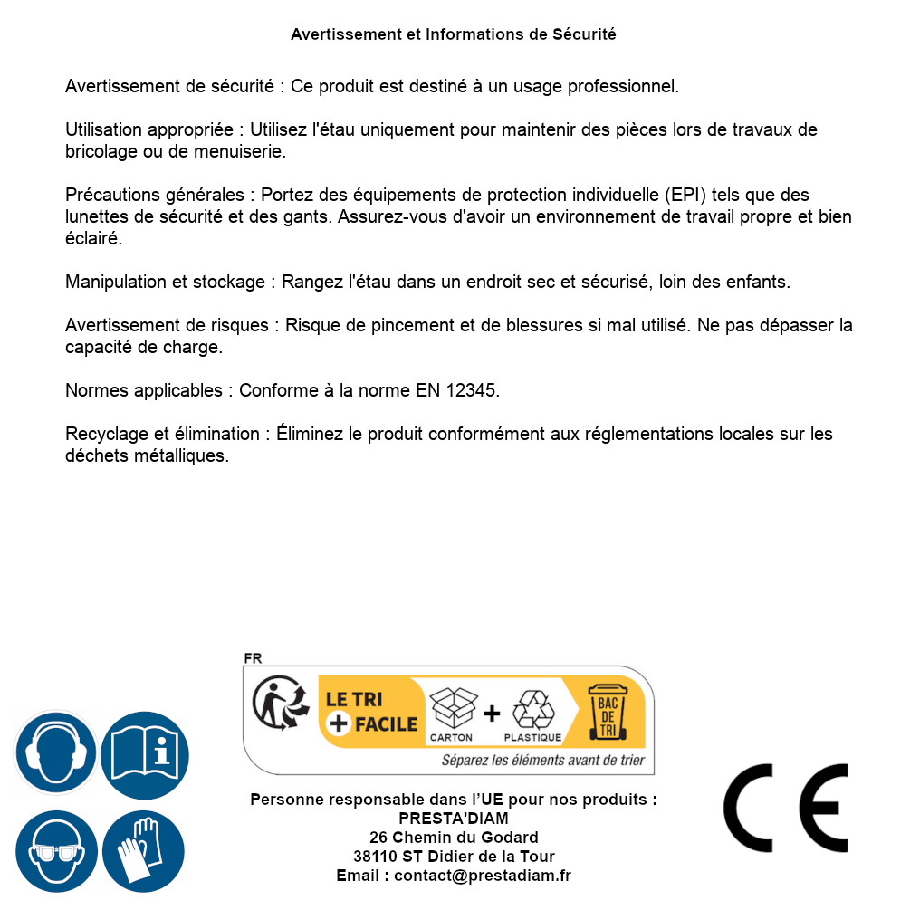 | WARNING and SAFETY | Avertissement de sécurité : Ce produit est destiné à un usage professionnel.Utilisation appropriée : Utilisez l'étau uniquement pour maintenir des pièces lors de travaux de bricolage ou de menuiserie.Précautions générales : Portez des équipements de protection individuelle (EPI) tels que des lunettes de sécurité et des gants. Assurez-vous d'avoir un environnement de travail propre et bien éclairé.Manipulation et stockage : Rangez l'étau dans un endroit sec et sécurisé, loin des enfants.Avertissement de risques : Risque de pincement et de blessures si mal utilisé. Ne pas dépasser la capacité de charge.Normes applicables : Conforme à la norme EN 12345.Recyclage et élimination : Éliminez le produit conformément aux réglementations locales sur les déchets métalliques. Identification de la personne responsable dans l’UE : Nom : PRESTA'DIAM. Adresse : 26 Chemin du Godard, 38110 ST Didier de la Tour (France). Email : contact@prestadiam.fr. |