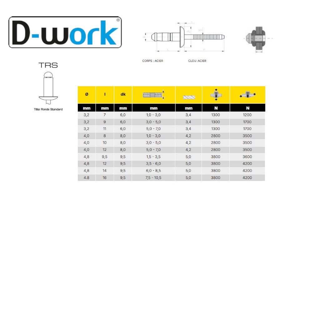 500 Rivets Aveugles Aluminium/Acier TR Gorivet ALX TRS 4x6 mm - Résistants et Faciles à Poser - D-Work
