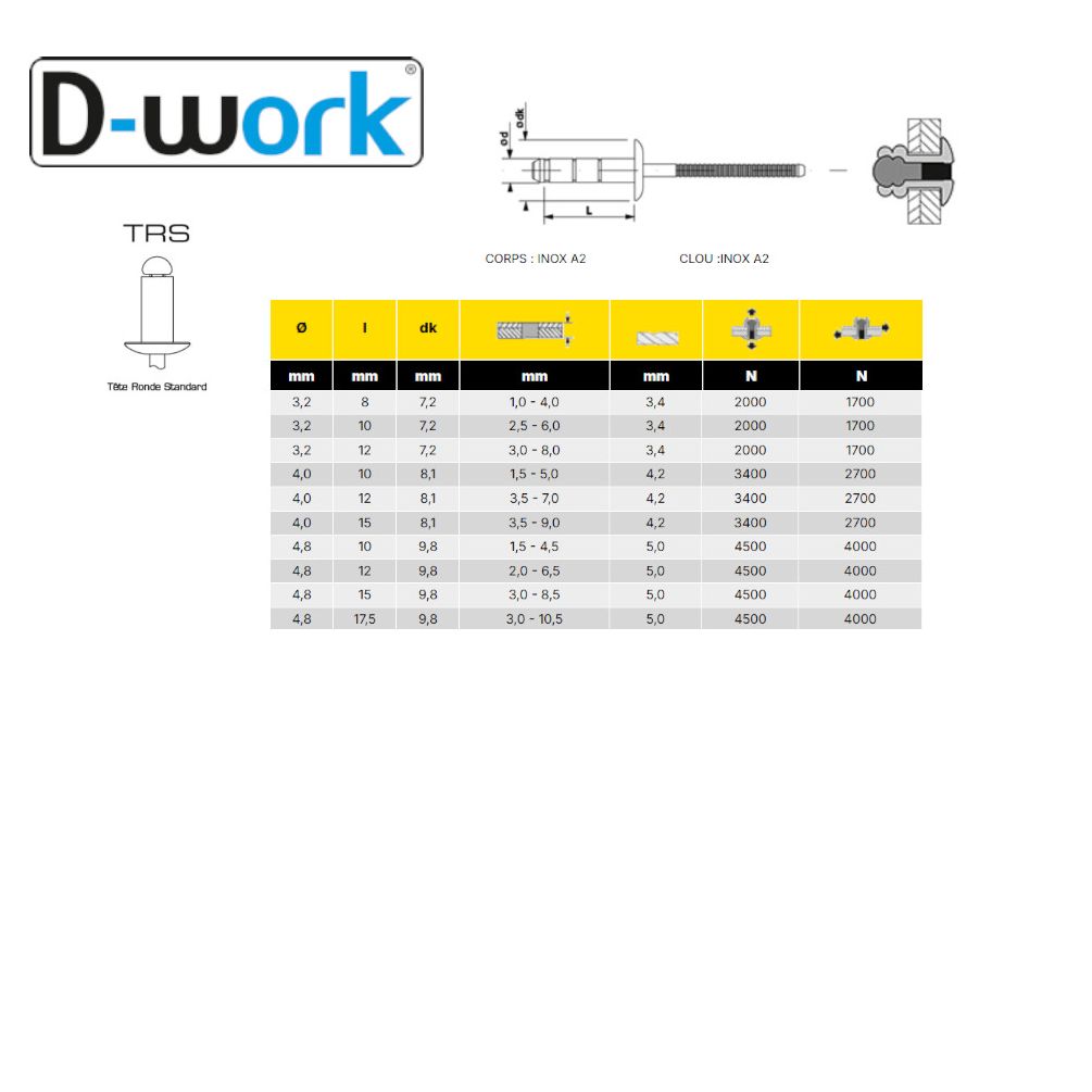 500 Rivets Aveugles Aluminium/Acier TR Gorivet ALX TRS 4x6 mm - Résistants et Faciles à Poser - D-Work