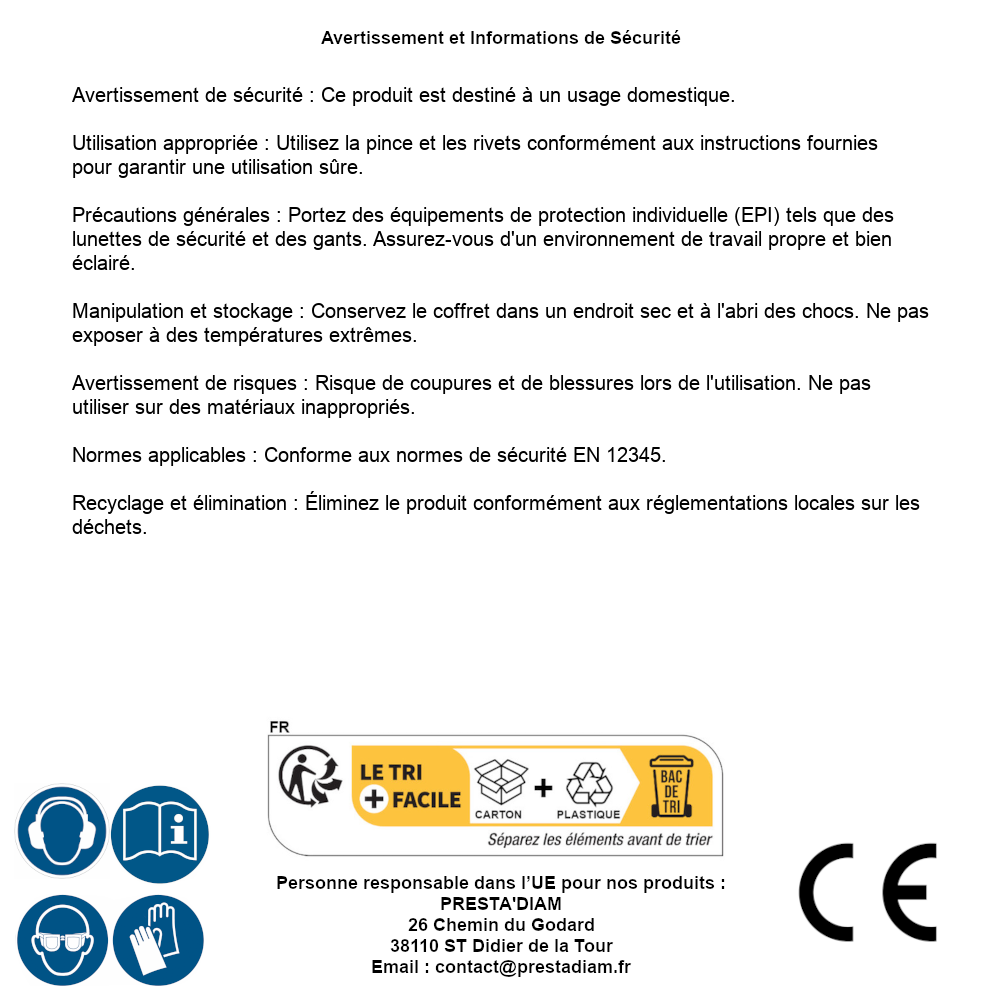 | WARNING and SAFETY | Avertissement de sécurité : Ce produit est destiné à un usage domestique. Utilisation appropriée : Utilisez la pince et les rivets conformément aux instructions fournies pour garantir une utilisation sûre. Précautions générales : Portez des équipements de protection individuelle (EPI) tels que des lunettes de sécurité et des gants. Assurez-vous d'un environnement de travail propre et bien éclairé. Manipulation et stockage : Conservez le coffret dans un endroit sec et à l'abri des chocs. Ne pas exposer à des températures extrêmes. Avertissement de risques : Risque de coupures et de blessures lors de l'utilisation. Ne pas utiliser sur des matériaux inappropriés. Normes applicables : Conforme aux normes de sécurité EN 12345. Recyclage et élimination : Éliminez le produit conformément aux réglementations locales sur les déchets. Identification de la personne responsable dans l’UE : Nom : PRESTA'DIAM. Adresse : 26 Chemin du Godard, 38110 ST Didier de la Tour (France). Email : contact@prestadiam.fr. |