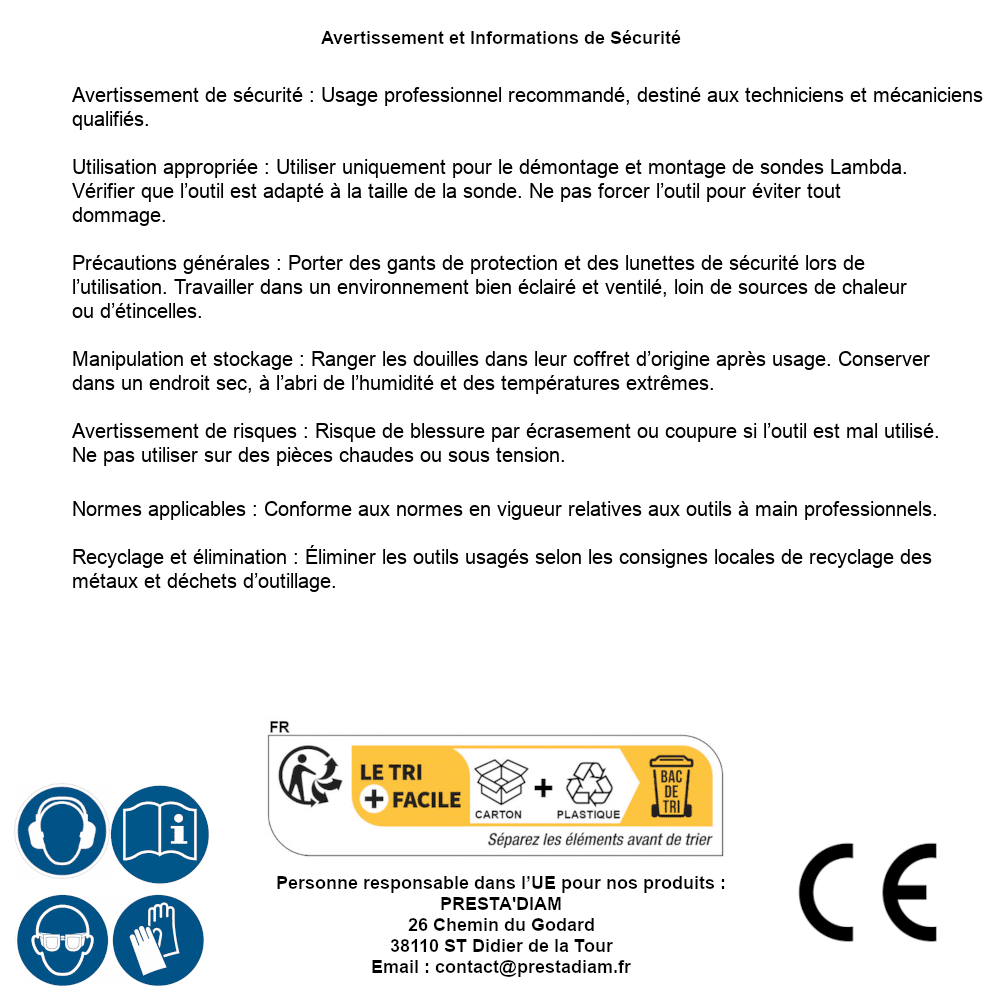 | WARNING and SAFETY | Identification de la personne responsable dans l’UE : Nom : PRESTA'DIAM. Adresse : 26 Chemin du Godard, 38110 ST Didier de la Tour (France). Email : contact@prestadiam.fr. |
