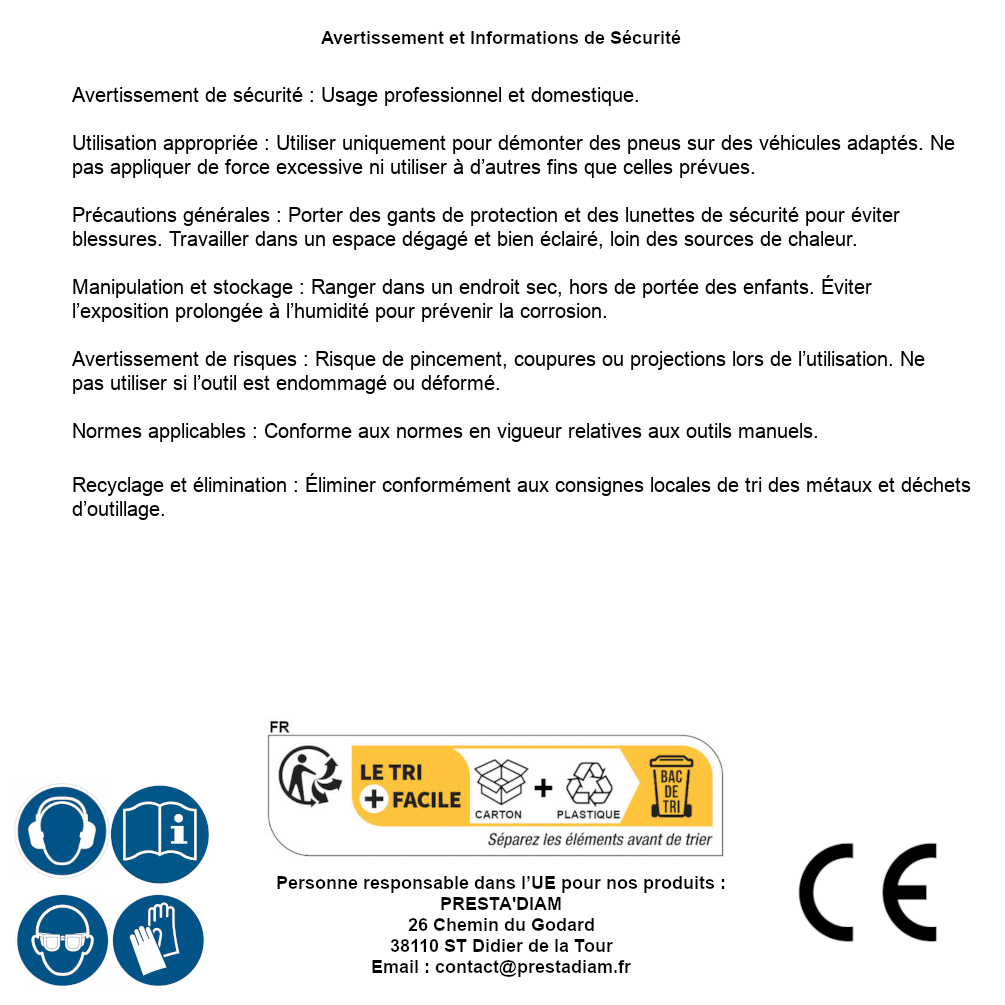 | WARNING and SAFETY | Identification de la personne responsable dans l’UE : Nom : PRESTA'DIAM. Adresse : 26 Chemin du Godard, 38110 ST Didier de la Tour (France). Email : contact@prestadiam.fr. |