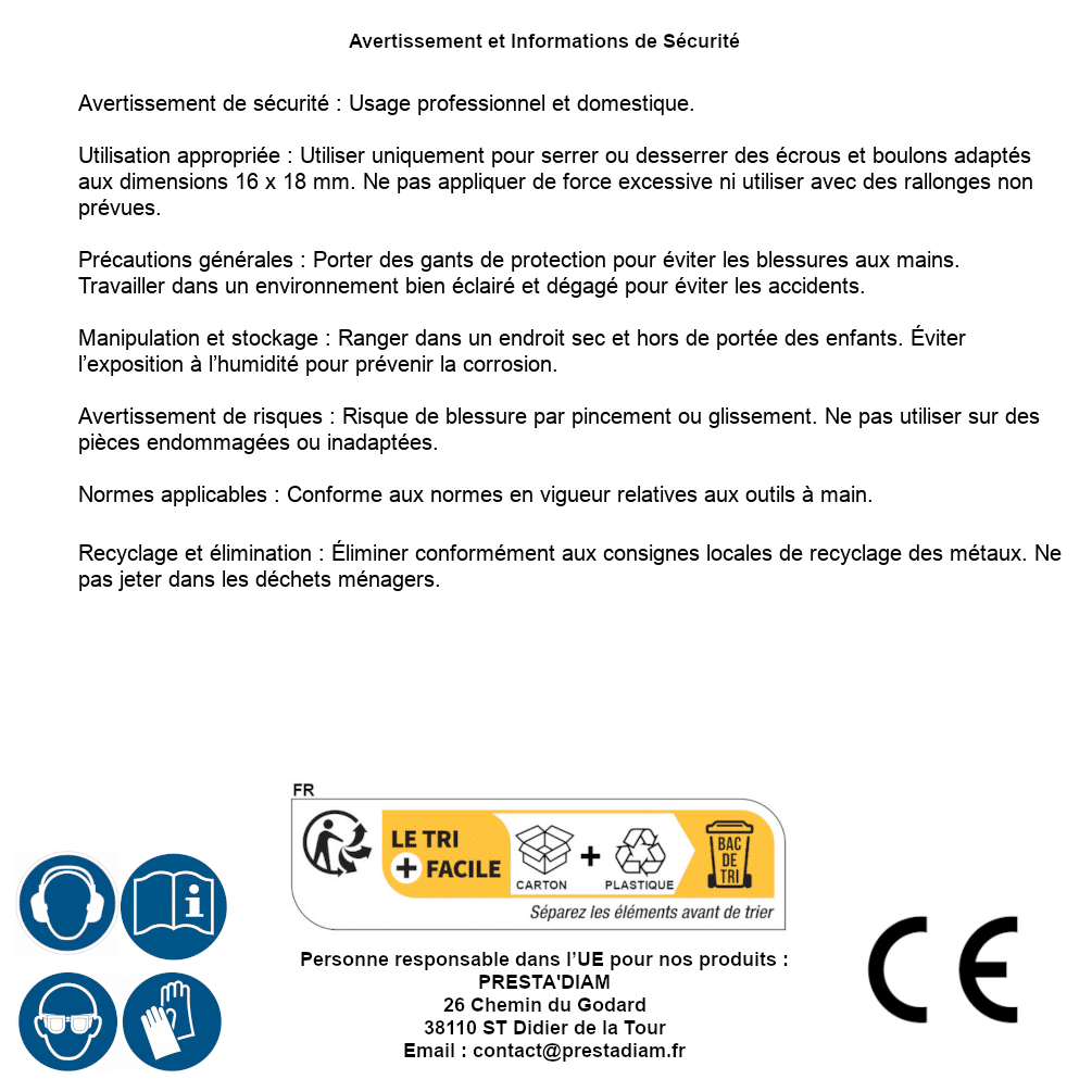 | WARNING and SAFETY | Identification de la personne responsable dans l’UE : Nom : PRESTA'DIAM. Adresse : 26 Chemin du Godard, 38110 ST Didier de la Tour (France). Email : contact@prestadiam.fr. |