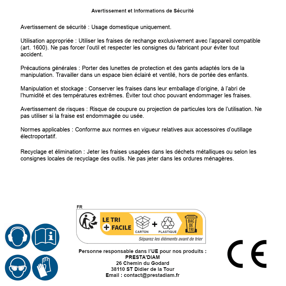 | WARNING and SAFETY | Identification de la personne responsable dans l’UE : Nom : PRESTA'DIAM. Adresse : 26 Chemin du Godard, 38110 ST Didier de la Tour (France). Email : contact@prestadiam.fr. |