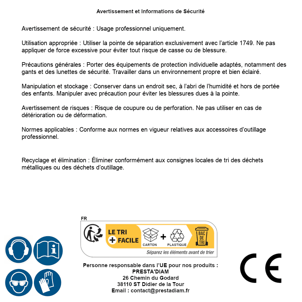 | WARNING and SAFETY | Identification de la personne responsable dans l’UE : Nom : PRESTA'DIAM. Adresse : 26 Chemin du Godard, 38110 ST Didier de la Tour (France). Email : contact@prestadiam.fr. |