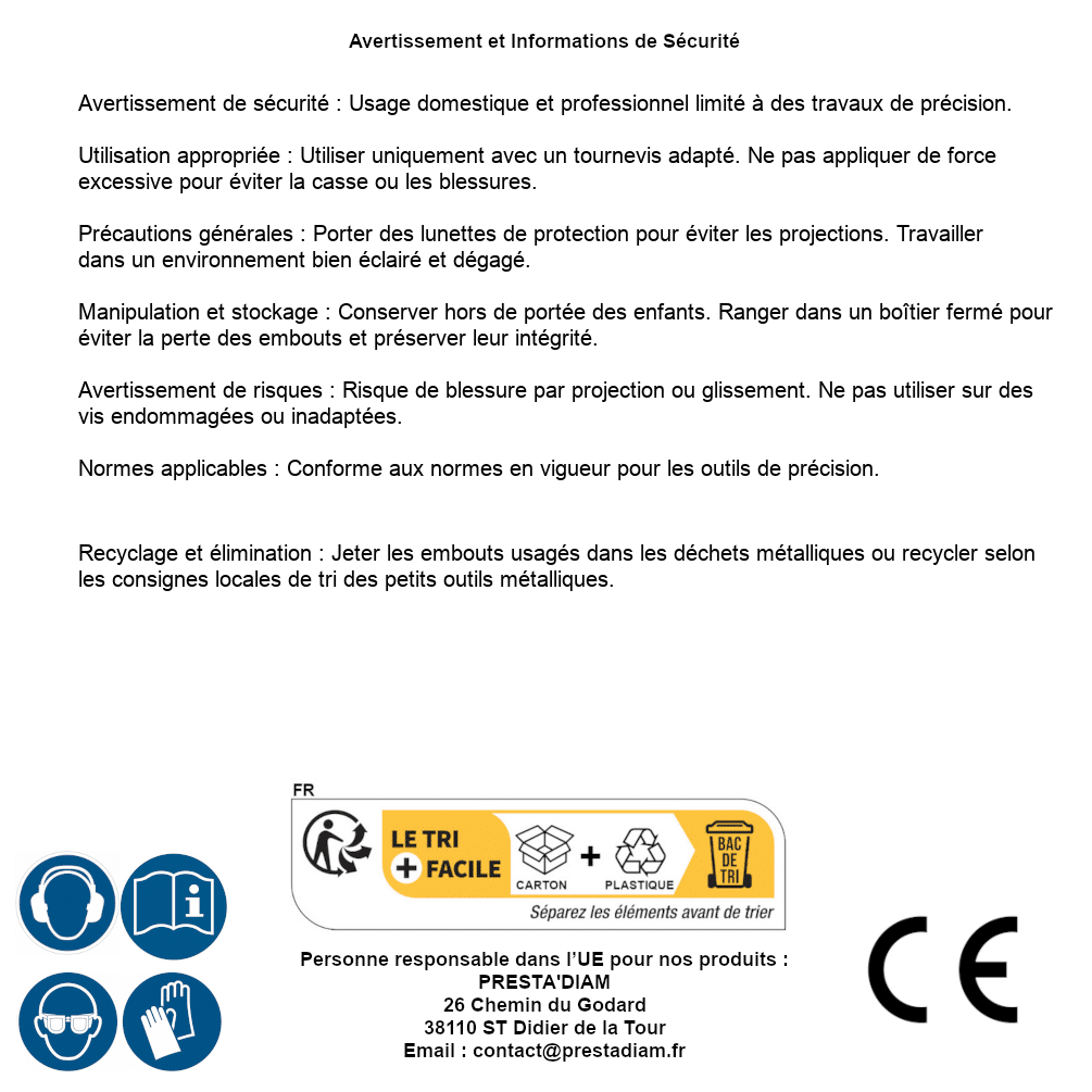 | WARNING and SAFETY | Identification de la personne responsable dans l’UE : Nom : PRESTA'DIAM. Adresse : 26 Chemin du Godard, 38110 ST Didier de la Tour (France). Email : contact@prestadiam.fr. |